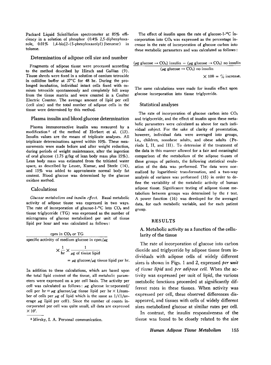 Glucose metabolism and insulin sensitivity of isolated human adipose tissue was studied as a function of adipose cell size and number. Glucose metabolism by these tissues was closely related to the number of cells in the fragment, irrespective of cell size. Adipose cells of obese individuals metabolized glucose to carbon dioxide and triglyceride at rates similar to adipose cells of nonobese subjects. In contrast, insulin responsiveness of adipose tissue was dependent upon adipose cell size. The larger its adipose cells the less insulin sensitive was the tissue. Thus, adipose tissue of obese subjects, with enlarged cells, showed a diminished response to insulin. After weight loss and reduction in adipose cell size, insulin sensitivity of the adipose tissue of obese patients was restored to normal. When adipose tissue of obese individuals showed impaired responsiveness to insulin, their plasma insulin levels, after oral glucose, were elevated. Weight loss and reduction in adipose cell size restored plasma insulin concentration to normal, concomitant with the return of normal tissue insulin sensitivity.