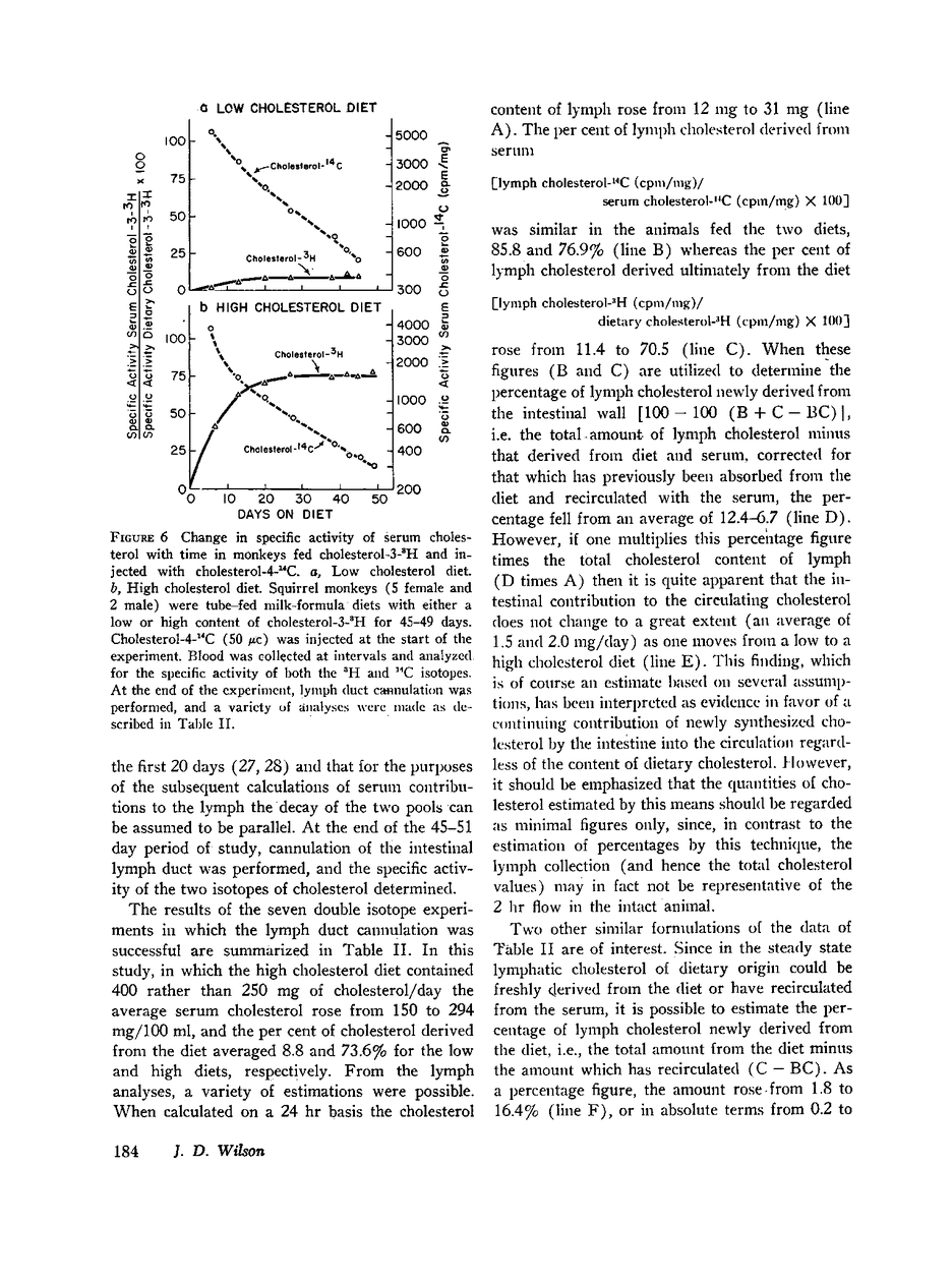 The possibility that the intestinal wall serves as a biosynthetic site for serum cholesterol has been examined in two types of studies in the squirrel monkey. First, animals were fed cholesterol in order to inhibit cholesterol synthesis in the liver, and the intestinal lymph ducts were cannulated. After the administration of acetate-2-14C it was possible to demonstrate that cholesterol synthesized by the intestinal wall enters intestinal lymph and thereby in the intact animal enters the circulating pool. Second, an attempt to quantitate the significance of this intestinal contribution has been made in animals fed cholesterol-3-3H and injected with cholesterol-4-14C for long periods. By an application of the technique of analysis utilizing the isotopic steady state we estimated as a minimal value that in the squirrel monkey 1.5-2.0 mg of cholesterol synthesized in the intestinal wall reaches the circulation each day.