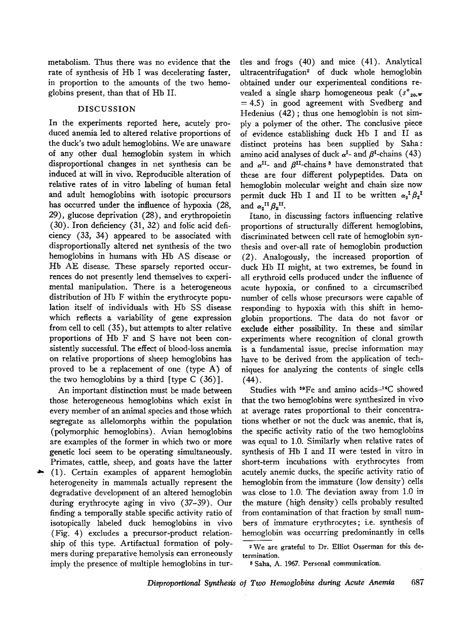 Concurrent synthesis of two or more hemoglobins occurs in normal man, the human hemoglobinopathies, and certain animal species. Duck erythrocytes produced in response to acutely induced anemic hypoxia (hemolysis or blood loss) contained reciprocally altered proportions of Hb I (α2I β2I) and Hb II (α2II β2II); the relative proportion of Hb II was 50-100% increased. Relative rates of synthesis of the two hemoglobins remained proportional to their new concentrations throughout erythroid maturation. This information favors the proposal that relatively increased activity, not delayed decay, of biosynthetic processes responsible for net synthesis of Hb II had occurred. These studies support the concept that the individual biosyntheses of multiple hemoglobins, presumably under genetic control, are potentially manipulable, and they provide evidence for one mechanism leading in a reproducible fashion to alterations in net synthesis in vivo.