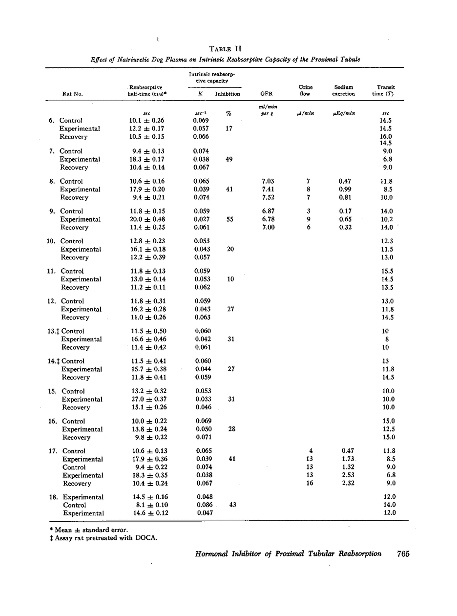 Evidence for the elaboration of a hormonal inhibitor of renal tubular reabsorption in response to expansion of extracellular fluid volume was obtained by examining the effects of plasma from rats and dogs undergoing saline diuresis on the rate of proximal tubular reabsorption measured both directly by micropuncture techniques and indirectly by clearance techniques.