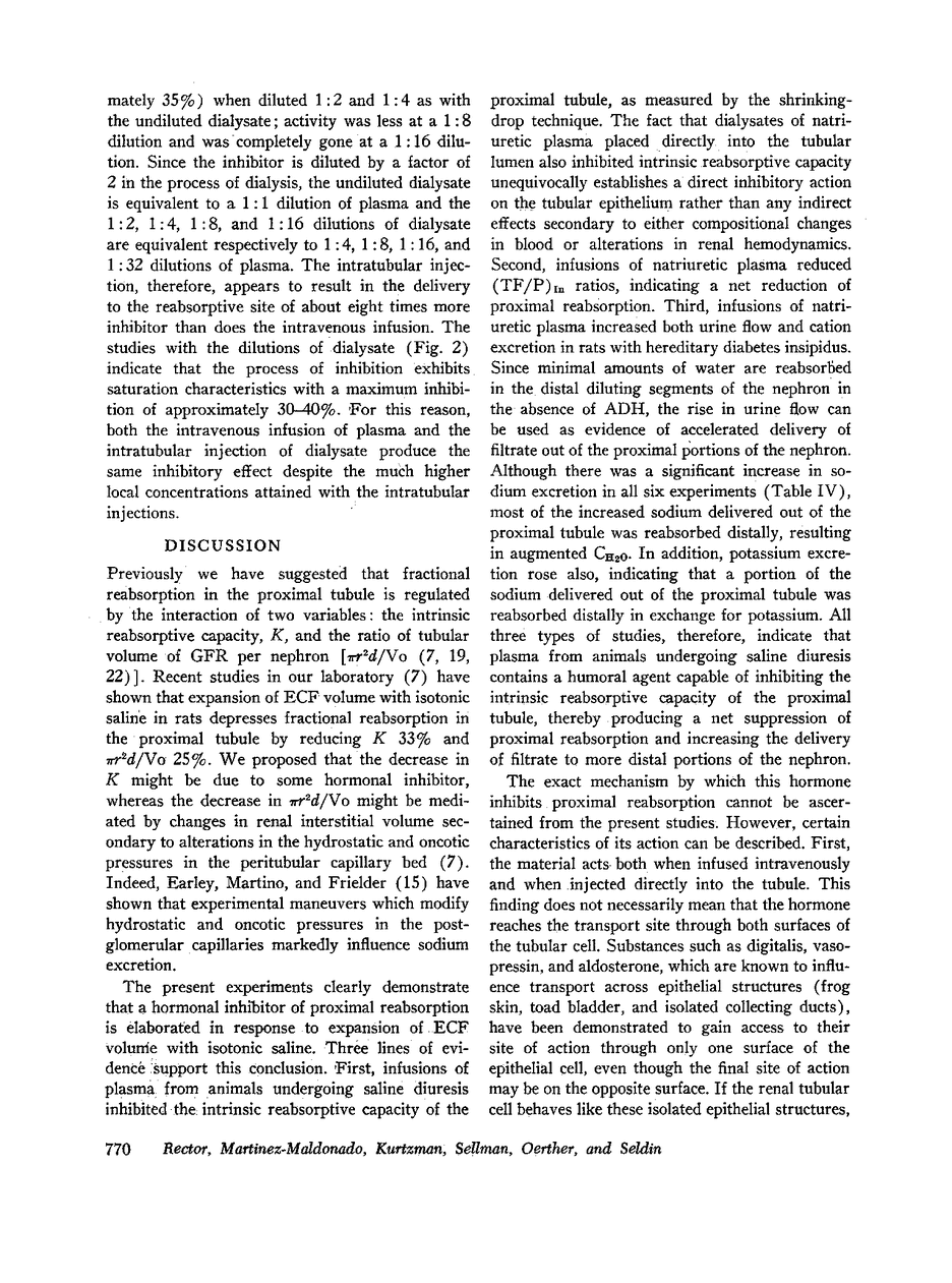 Evidence for the elaboration of a hormonal inhibitor of renal tubular reabsorption in response to expansion of extracellular fluid volume was obtained by examining the effects of plasma from rats and dogs undergoing saline diuresis on the rate of proximal tubular reabsorption measured both directly by micropuncture techniques and indirectly by clearance techniques.
