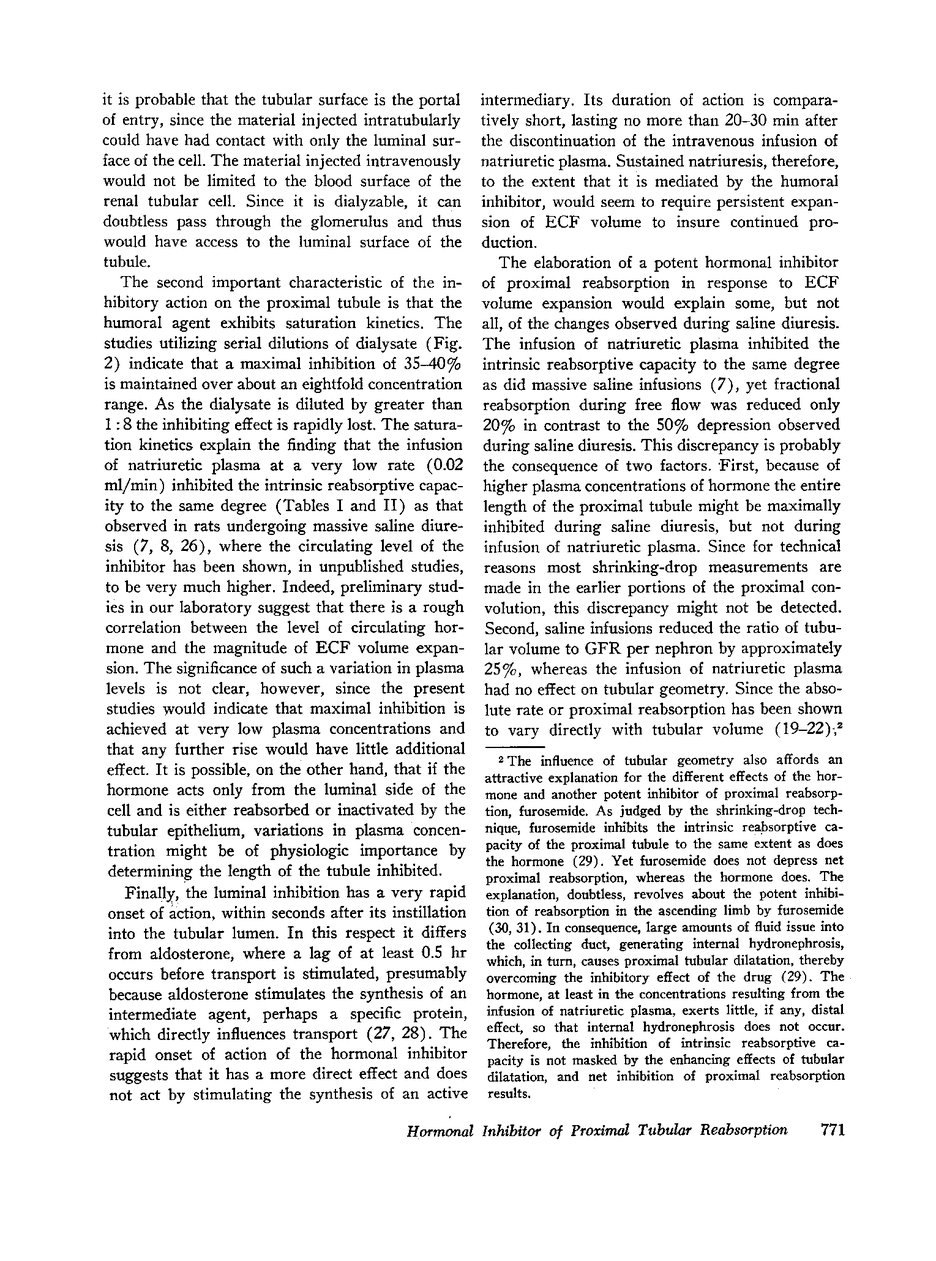 Evidence for the elaboration of a hormonal inhibitor of renal tubular reabsorption in response to expansion of extracellular fluid volume was obtained by examining the effects of plasma from rats and dogs undergoing saline diuresis on the rate of proximal tubular reabsorption measured both directly by micropuncture techniques and indirectly by clearance techniques.