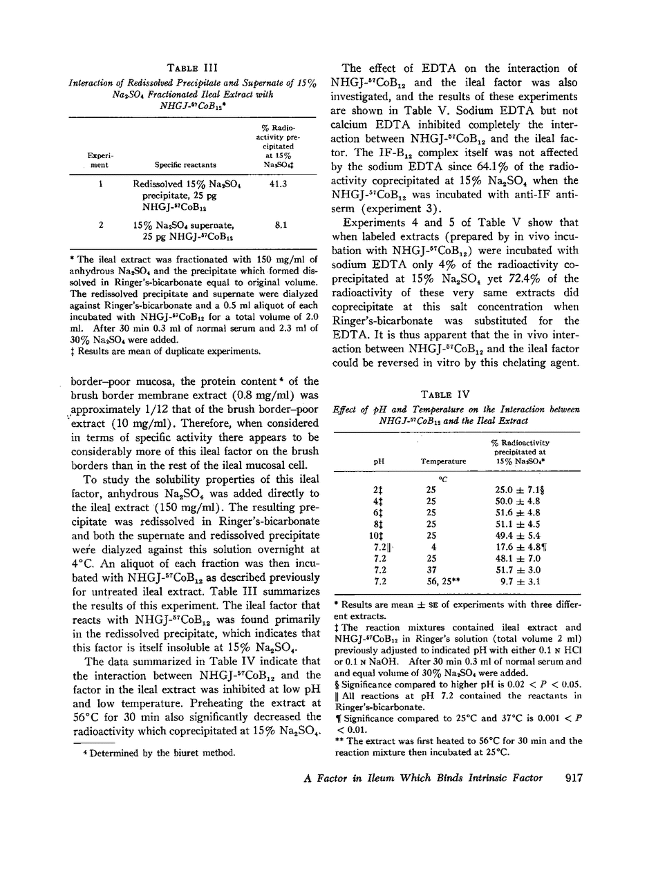 The precipitate which resulted when 57CoB12 bound to normal human gastric juice was subjected to a 15% concentration of Na2SO4 contained virtually no radioactivity. However, after in vivo incubation of the gastric juice-57CoB12 mixture in the distal ileum of the guinea pig, the dialyzed extract of the washed mucosa contained a fraction of 57CoB12 which was precipitated at 15% Na2SO4. In addition, in vitro incubation of gastric juice-57CoB12 with an extract of the ileal mucosa or brush border membranes also resulted in the formation of a 15% Na2SO4-insoluble fraction which contained 57CoB12. The formation of this 57CoB12-containing insoluble fraction did not occur or was diminished by (a) addition of an excess of B12-free normal human gastric juice. (b) reducing the incubation pH to 2, (c) incubating the mixture at 4°C, (d) pretreating the ileal extract at 56°C for 30 min, (e) incubating the reaction in sodium EDTA but not calcium EDTA, (f) incubating gastric juice-57CoB12 with an extract of jejunal mucosa. Sephadex gel filtration was used to demonstrate that the factor in the ileal extract which reacted with the gastric juice-57CoB12 filtered through G-100 and G-200 columns in the excluded volume.
