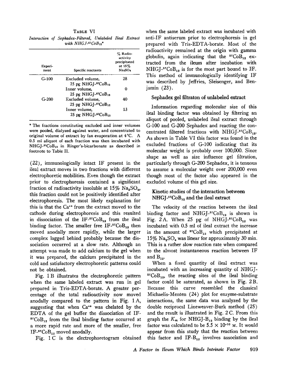 The precipitate which resulted when 57CoB12 bound to normal human gastric juice was subjected to a 15% concentration of Na2SO4 contained virtually no radioactivity. However, after in vivo incubation of the gastric juice-57CoB12 mixture in the distal ileum of the guinea pig, the dialyzed extract of the washed mucosa contained a fraction of 57CoB12 which was precipitated at 15% Na2SO4. In addition, in vitro incubation of gastric juice-57CoB12 with an extract of the ileal mucosa or brush border membranes also resulted in the formation of a 15% Na2SO4-insoluble fraction which contained 57CoB12. The formation of this 57CoB12-containing insoluble fraction did not occur or was diminished by (a) addition of an excess of B12-free normal human gastric juice. (b) reducing the incubation pH to 2, (c) incubating the mixture at 4°C, (d) pretreating the ileal extract at 56°C for 30 min, (e) incubating the reaction in sodium EDTA but not calcium EDTA, (f) incubating gastric juice-57CoB12 with an extract of jejunal mucosa. Sephadex gel filtration was used to demonstrate that the factor in the ileal extract which reacted with the gastric juice-57CoB12 filtered through G-100 and G-200 columns in the excluded volume.