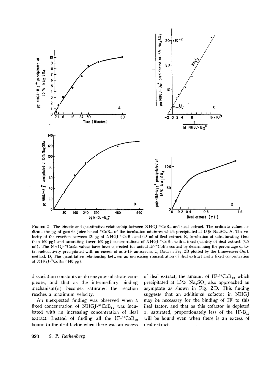 The precipitate which resulted when 57CoB12 bound to normal human gastric juice was subjected to a 15% concentration of Na2SO4 contained virtually no radioactivity. However, after in vivo incubation of the gastric juice-57CoB12 mixture in the distal ileum of the guinea pig, the dialyzed extract of the washed mucosa contained a fraction of 57CoB12 which was precipitated at 15% Na2SO4. In addition, in vitro incubation of gastric juice-57CoB12 with an extract of the ileal mucosa or brush border membranes also resulted in the formation of a 15% Na2SO4-insoluble fraction which contained 57CoB12. The formation of this 57CoB12-containing insoluble fraction did not occur or was diminished by (a) addition of an excess of B12-free normal human gastric juice. (b) reducing the incubation pH to 2, (c) incubating the mixture at 4°C, (d) pretreating the ileal extract at 56°C for 30 min, (e) incubating the reaction in sodium EDTA but not calcium EDTA, (f) incubating gastric juice-57CoB12 with an extract of jejunal mucosa. Sephadex gel filtration was used to demonstrate that the factor in the ileal extract which reacted with the gastric juice-57CoB12 filtered through G-100 and G-200 columns in the excluded volume.