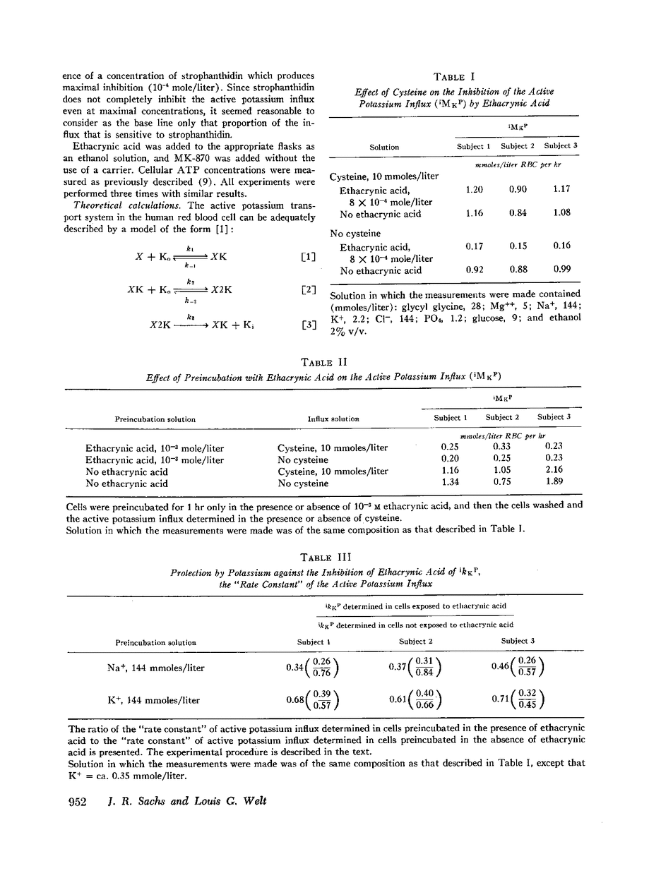 The active potassium influx in the human red blood cell is inhibited by strophanthidin, ethacrynic acid, and MK-870 (a new diuretic), and the degree of inhibition is greater at low concentrations of extracellular potassium than at high. In the case of ethacrynic acid, potassium appears to diminish the rate of combination of the drug with the transport system. The kinetic behavior of the active potassium influx in the presence of the inhibitors strophanthidin and ethacrynic acid is consistent with a model in which the binding of potassium at one of the potassium-sensitive sites in the transport system reduces the affinity of the system for the drug, and binding of a second potassium ion further reduces the affinity. It is not possible to distinguish between the sites on the basis of the studies presented here.