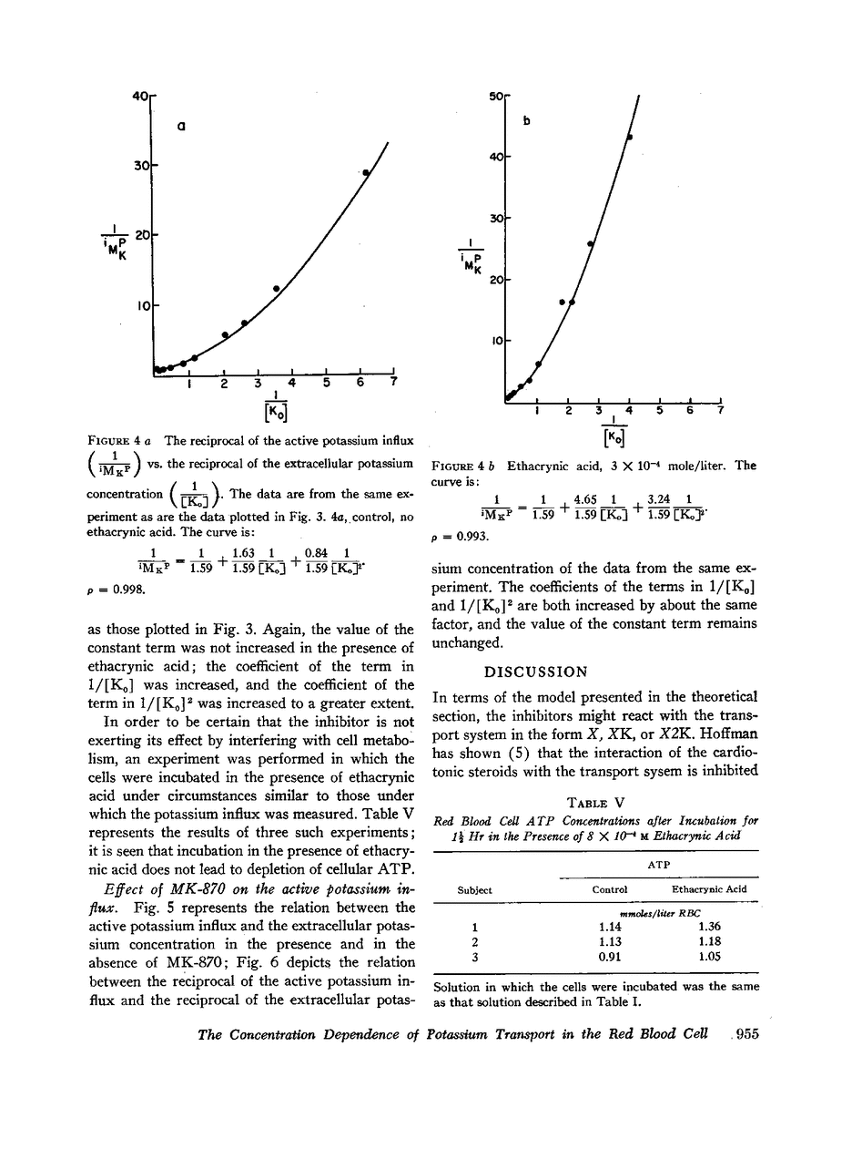 The active potassium influx in the human red blood cell is inhibited by strophanthidin, ethacrynic acid, and MK-870 (a new diuretic), and the degree of inhibition is greater at low concentrations of extracellular potassium than at high. In the case of ethacrynic acid, potassium appears to diminish the rate of combination of the drug with the transport system. The kinetic behavior of the active potassium influx in the presence of the inhibitors strophanthidin and ethacrynic acid is consistent with a model in which the binding of potassium at one of the potassium-sensitive sites in the transport system reduces the affinity of the system for the drug, and binding of a second potassium ion further reduces the affinity. It is not possible to distinguish between the sites on the basis of the studies presented here.