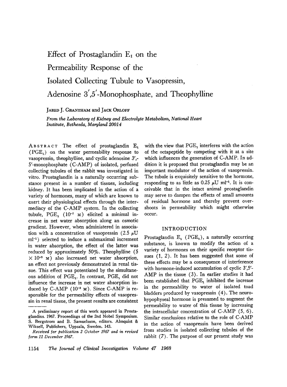 The effect of prostaglandin E1 (PGE1) on the water permeability response to vasopressin, theophylline, and cyclic adenosine 3′,5′-monophosphate (C-AMP) of isolated, perfused collecting tubules of the rabbit was investigated in vitro. Prostaglandin is a naturally occurring substance present in a number of tissues, including kidney. It has been implicated in the action of a variety of hormones, many of which are known to exert their physiological effects through the intermediacy of the C-AMP system. In the collecting tubule, PGE1 (10-7 M) elicited a minimal increase in net water absorption along an osmotic gradient. However, when administered in association with a concentration of vasopressin (2.5 μU ml-1) selected to induce a submaximal increment in water absorption, the effect of the latter was reduced by approximately 50%. Theophylline (5 × 10-3 M) also increased net water absorption, an effect not previously demonstrated in renal tissue. This effect was potentiated by the simulataneous addition of PGE1. In contrast, PGE1 did not influence the increase in net water absorption induced by C-AMP (10-2 M). Since C-AMP is responsible for the permeability effects of vasopressin in renal tissue, the present results are consistent with the view that PGE1 interferes with the action of the octapeptide by competing with it at a site which influences the generation of C-AMP. In addition it is proposed that prostaglandin may be an important modulator of the action of vasopressin. The tubule is exquisitely sensitive to the hormone, responding to as little as 0.25 μU ml-1. It is conceivable that in the intact animal prostaglandin may serve to dampen the effects of small amounts of residual hormone and thereby prevent overshoots in permeability which might otherwise occur.