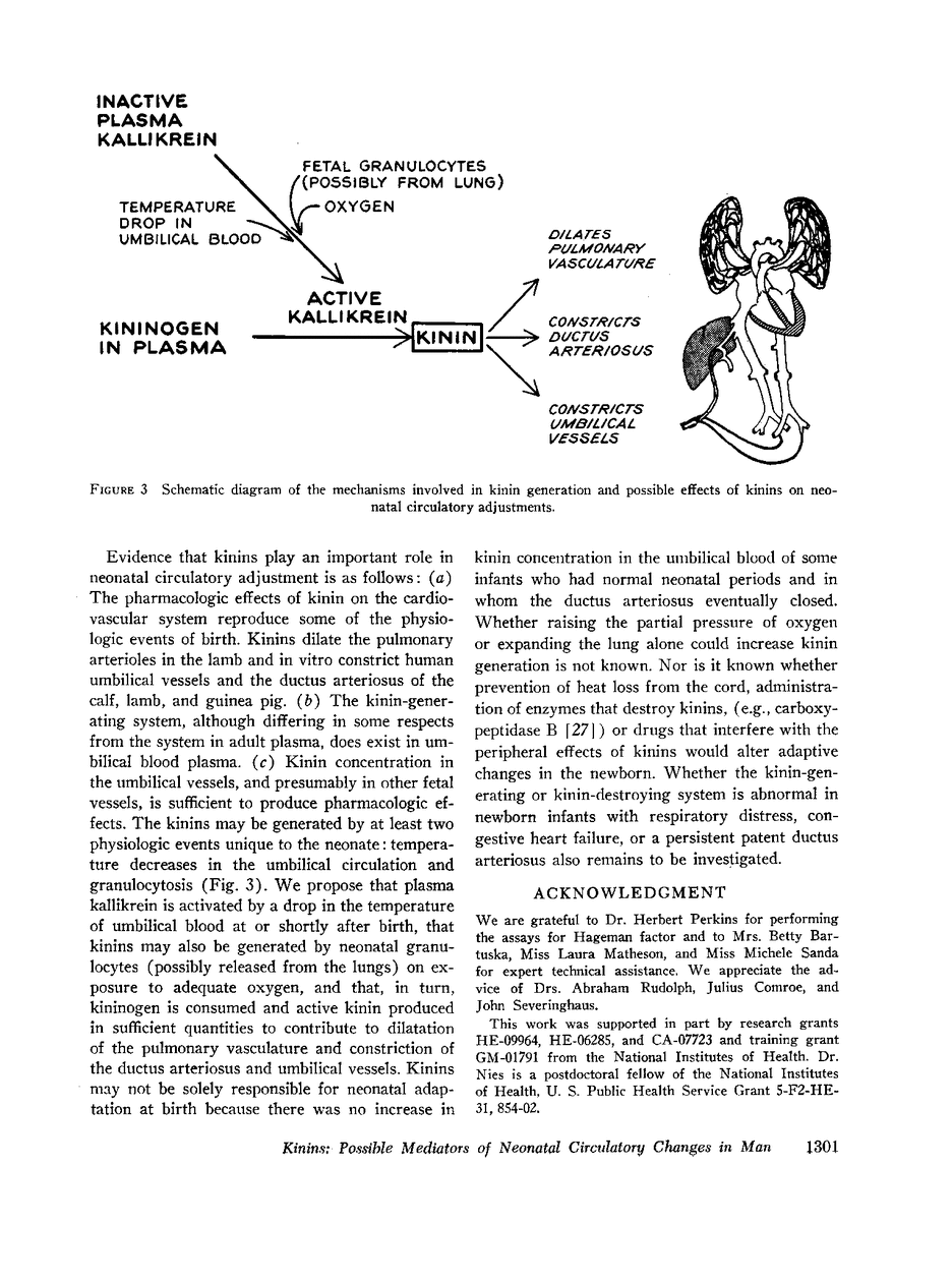 Bradykinin is a potent constrictor of the human umbilical artery and vein and the ductus arteriosus of the lamb in vitro at oxygen tensions above 40 mm Hg (comparable to those in the newborn infant). Bradykinin is also capable of producing remarkable dilatation of the pulmonary vasculature of the lamb. Theoretically, kinins are capable of effecting some of the rapid circulatory changes required of the neonate. The present study was undertaken to investigate the role of kinins as mediators of such changes.