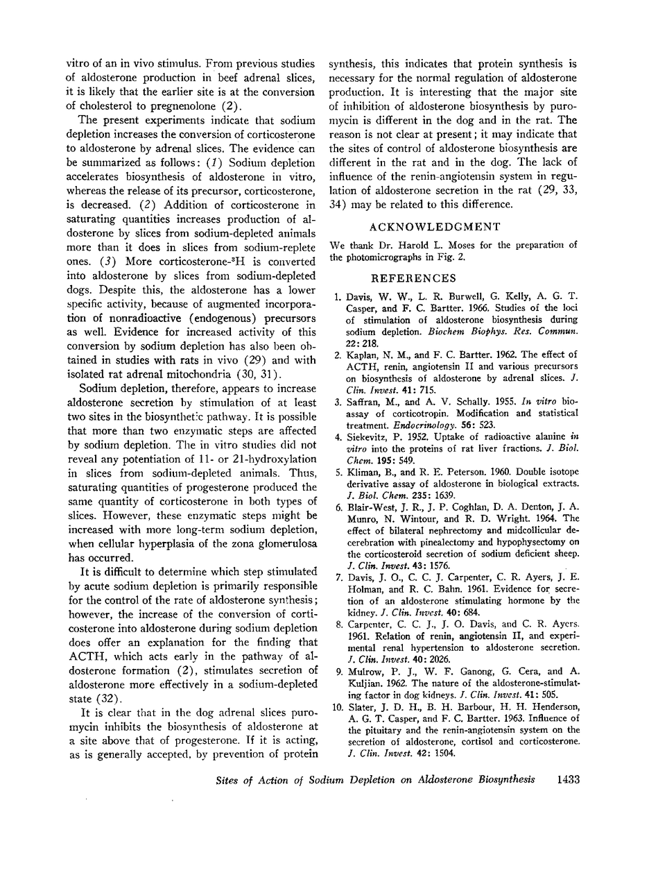 Secretion of cortisol, corticosterone, and aldosterone was measured in vivo in normal and sodium-depleted hypophysectomized dogs. Biogenesis of steroids was then measured in vitro with outer slices of the adrenals of the same dogs. In some studies, metyrapone or puromycin was added.