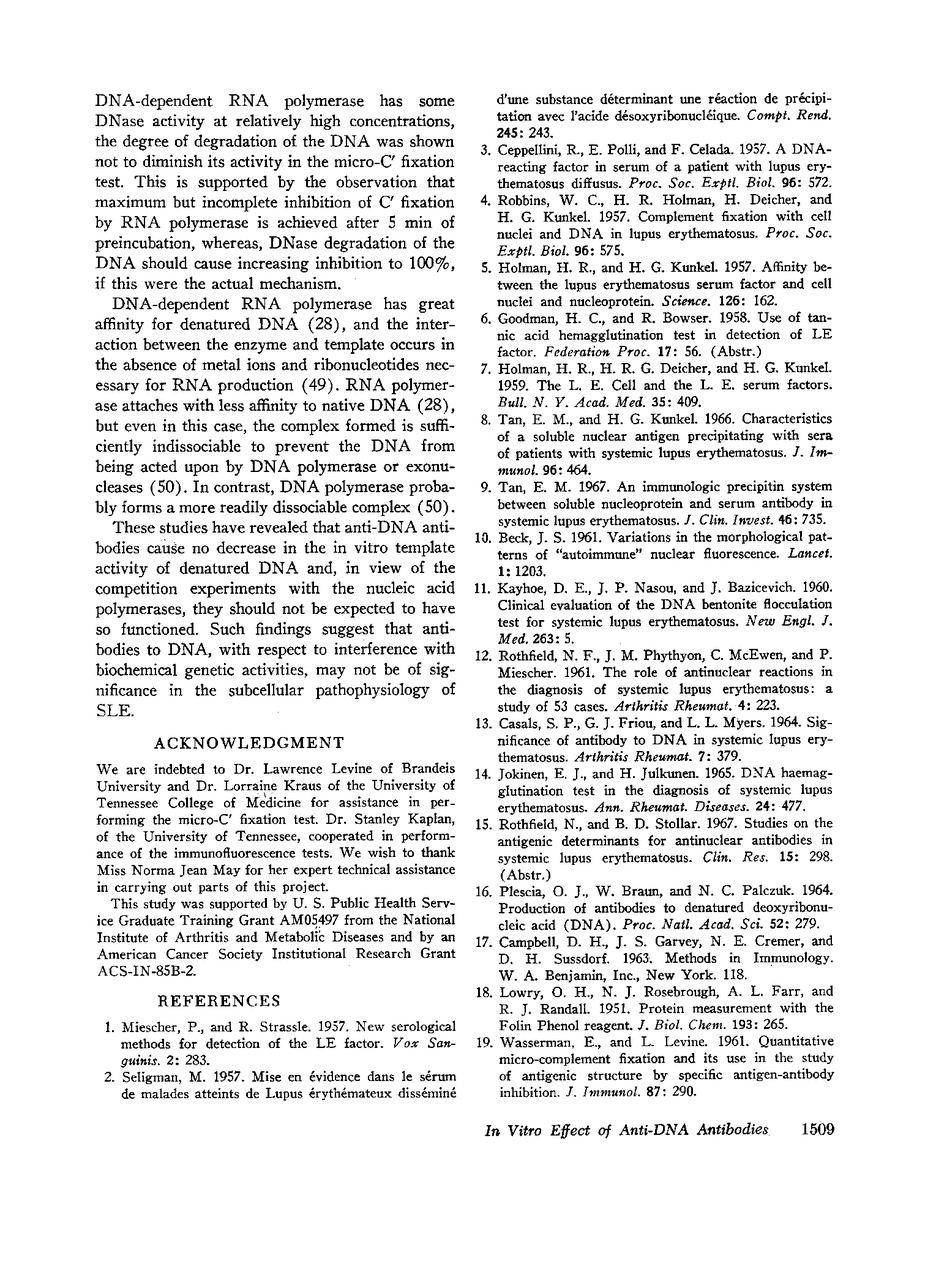 Blood samples containing antibodies to DNA were obtained from patients with systemic lupus erythematosus (SLE) and rabbits immunized with denatured DNA complexed to methylated bovine serum albumin. The immunoglobulin fractions from these sources did not decrease the over-all template activity of singlestranded DNA with DNA polymerase or DNA-dependent RNA polymerase. In competition studies, both DNA polymerase and DNA-dependent RNA polymerase inhibited the binding of DNA antibodies to single-stranded DNA, as evidenced by inhibition of micro-complement fixation. These findings suggest that antibodies to DNA fail to decrease denatured DNA template activity because the enzymes which use a single-stranded DNA template can displace or block the antibodies from the denatured DNA as a result of greater binding affinity to the denatured DNA. The anti-DNA antibodies associated with SLE, therefore, may not be involved in the pathogenesis of the intracellular abnormalities associated with the disease.