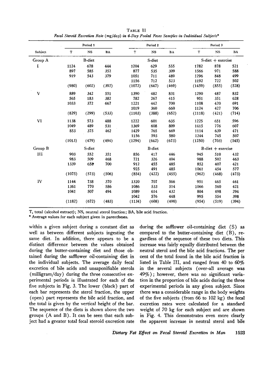 Fecal bile acid and neutral sterol excretion rates were determined in five healthy young men when serum cholesterol changes were induced by isocaloric substitution of an unsaturated (safflower oil) for a saturated fat (butter). The isotope balance method was used after the intravenous injection of cholesterol-4-14C. A feces extraction method is presented which permits essentially complete separation of fecal neutral sterols and bile acids.