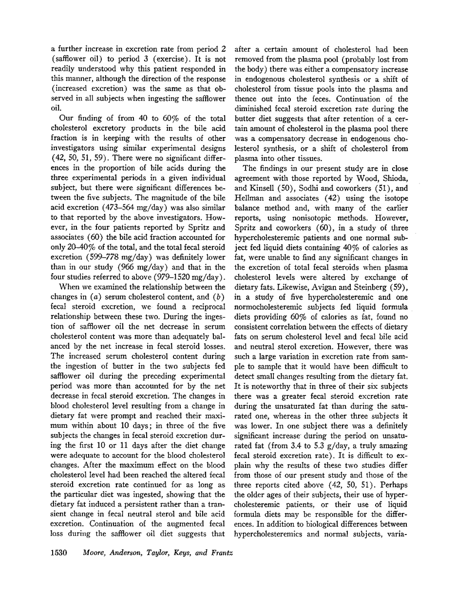 Fecal bile acid and neutral sterol excretion rates were determined in five healthy young men when serum cholesterol changes were induced by isocaloric substitution of an unsaturated (safflower oil) for a saturated fat (butter). The isotope balance method was used after the intravenous injection of cholesterol-4-14C. A feces extraction method is presented which permits essentially complete separation of fecal neutral sterols and bile acids.