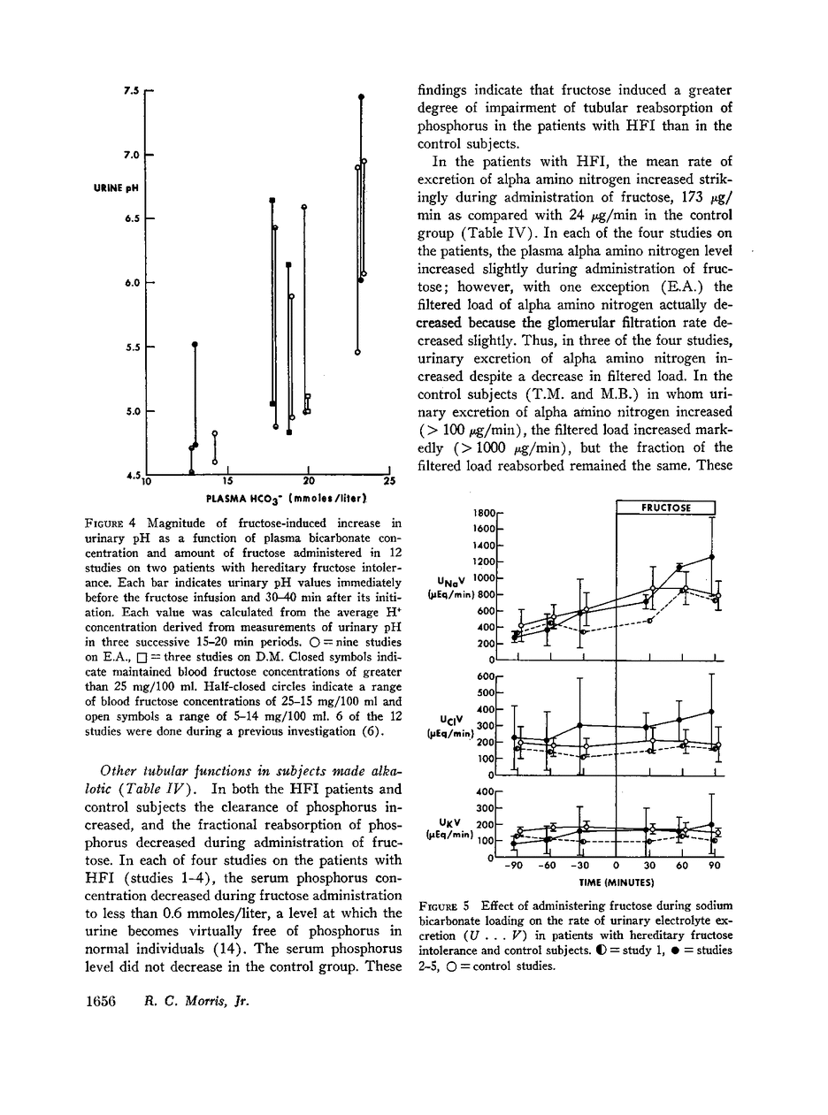 In adult patients with hereditary fructose intolerance (HFI) fructose induces a renal acidification defect characterized by (a) a 20-30% reduction in tubular reabsorption of bicarbonate (T HCO3-) at plasma bicarbonate concentrations ranging from 21-31 mEq/liter, (b) a maximal tubular reabsorption of bicarbonate (Tm HCO3-) of approximately 1.9 mEq/100 ml of glomerular filtrate, (c) disappearance of bicarbonaturia at plasma bicarbonate concentrations less than 15 mEq/liter, and (d) during moderately severe degrees of acidosis, a sustained capacity to maintain urinary pH at normal minima and to excrete acid at normal rates. In physiologic distinction from this defect, the renal acidification defect of patients with classic renal tubular acidosis is characterized by (a) just less than complete tubular reabsorption of bicarbonate at plasma bicarbonate concentrations of 26 mEq/liter or less, (b) a normal Tm HCO3- of approximately 2.8 mEq/100 ml of glomerular filtrate, and (c) during acidosis of an even severe degree, a quantitatively trivial bicarbonaturia, as well as (d) a urinary pH of greater than 6.
