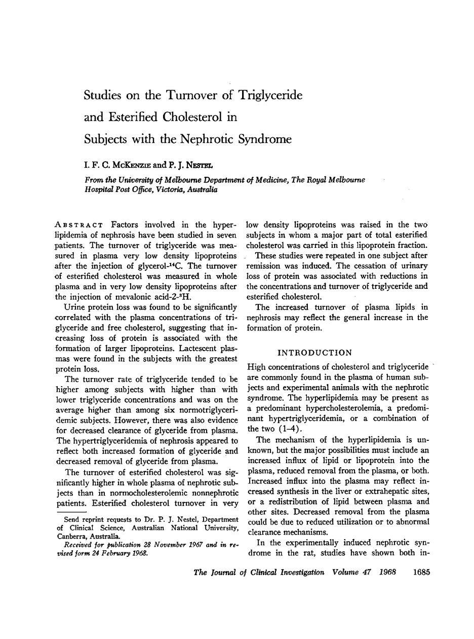 Factors involved in the hyperlipidemia of nephrosis have been studied in seven patients. The turnover of triglyceride was measured in plasma very low density lipoproteins after the injection of glycerol-14C. The turnover of esterified cholesterol was measured in whole plasma and in very low density lipoproteins after the injection of mevalonic acid-2-3H.