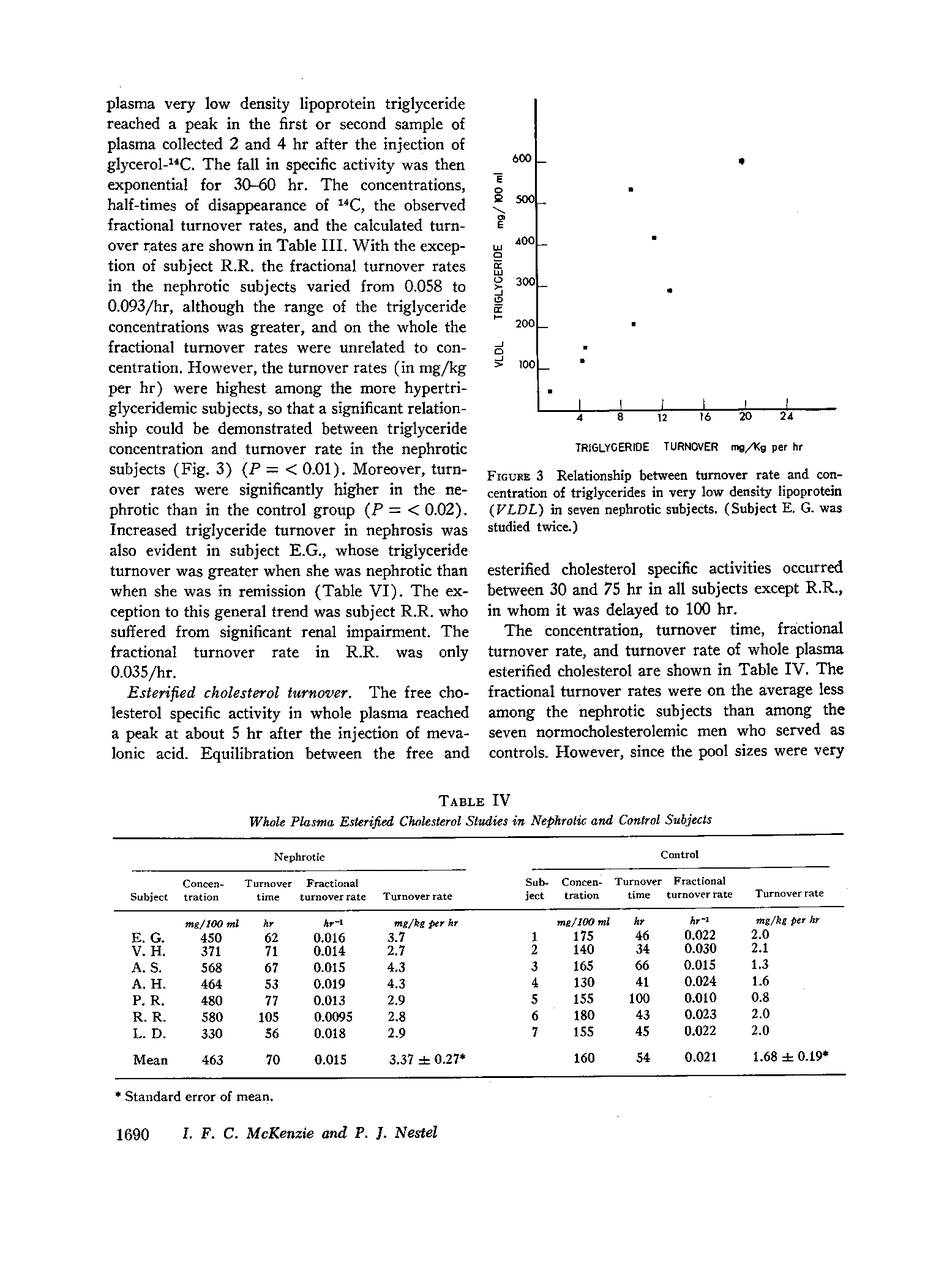 Factors involved in the hyperlipidemia of nephrosis have been studied in seven patients. The turnover of triglyceride was measured in plasma very low density lipoproteins after the injection of glycerol-14C. The turnover of esterified cholesterol was measured in whole plasma and in very low density lipoproteins after the injection of mevalonic acid-2-3H.