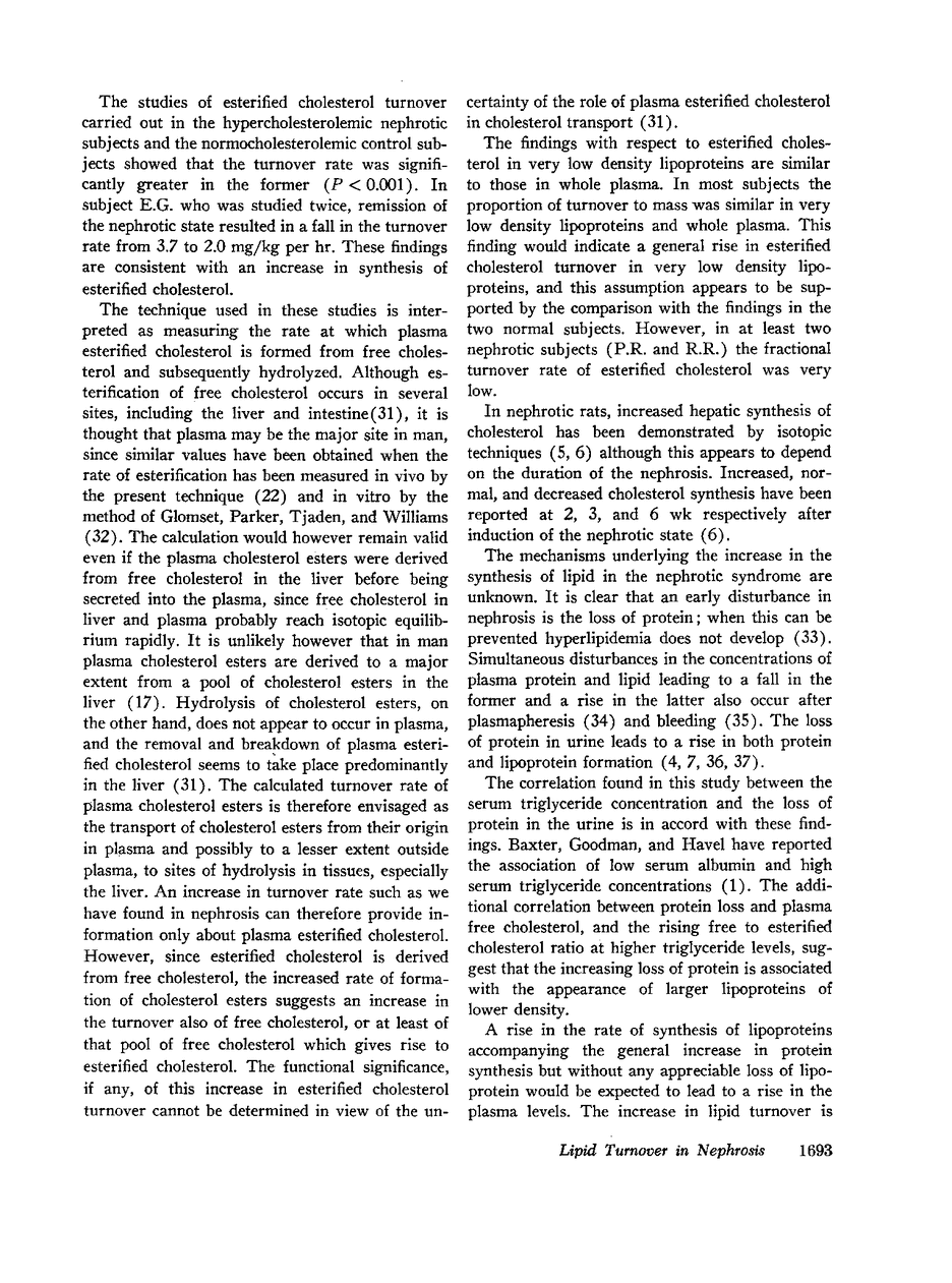 Factors involved in the hyperlipidemia of nephrosis have been studied in seven patients. The turnover of triglyceride was measured in plasma very low density lipoproteins after the injection of glycerol-14C. The turnover of esterified cholesterol was measured in whole plasma and in very low density lipoproteins after the injection of mevalonic acid-2-3H.