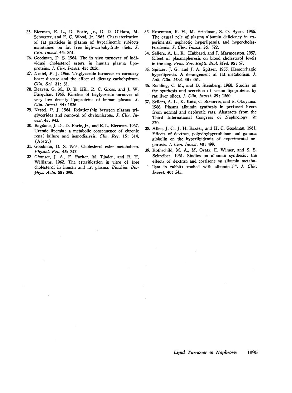Factors involved in the hyperlipidemia of nephrosis have been studied in seven patients. The turnover of triglyceride was measured in plasma very low density lipoproteins after the injection of glycerol-14C. The turnover of esterified cholesterol was measured in whole plasma and in very low density lipoproteins after the injection of mevalonic acid-2-3H.