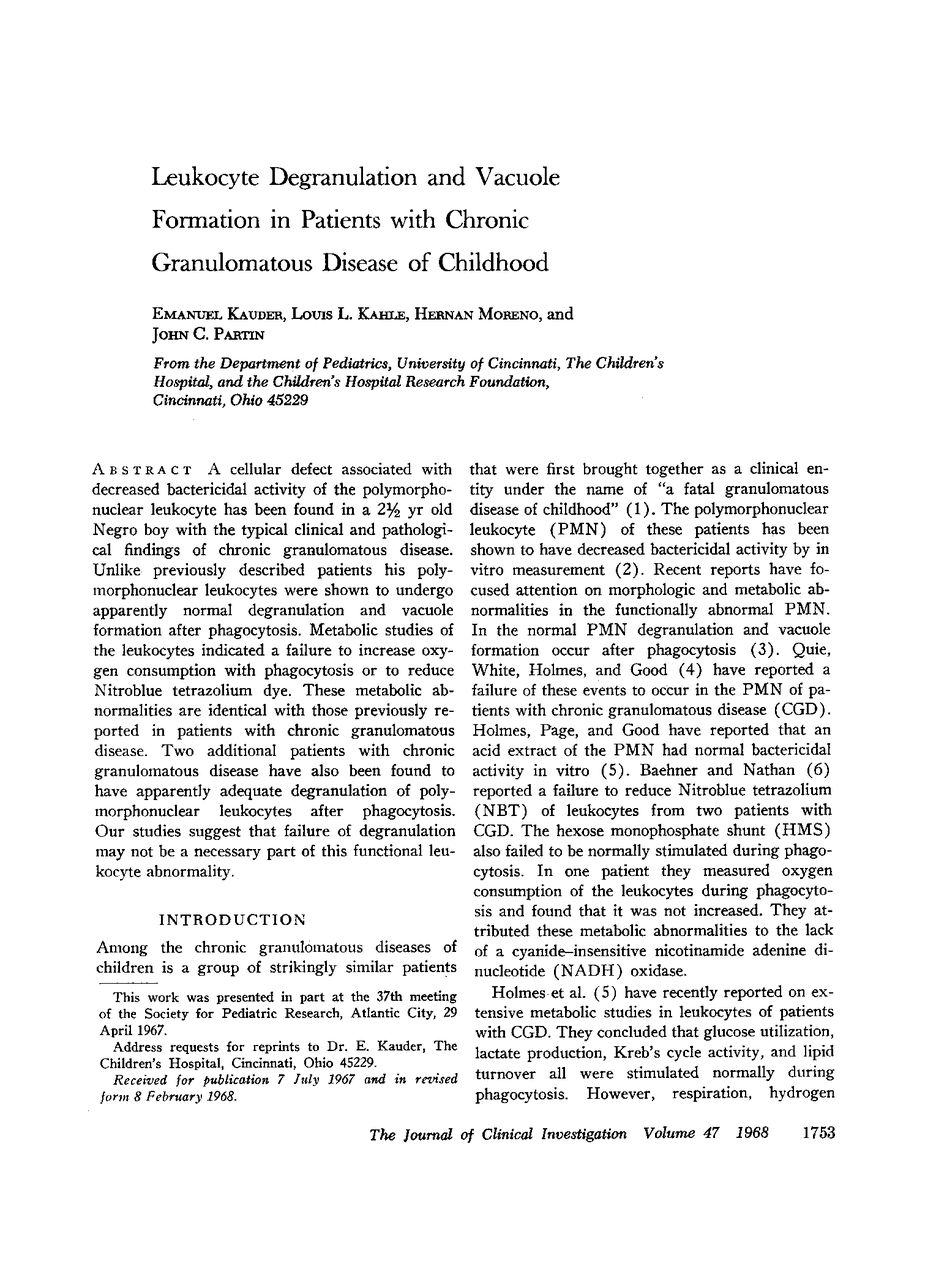 A cellular defect associated with decreased bactericidal activity of the polymorphonuclear leukocyte has been found in a 2½ yr old Negro boy with the typical clinical and pathological findings of chronic granulomatous disease. Unlike previously described patients his polymorphonuclear leukocytes were shown to undergo apparently normal degranulation and vacuole formation after phagocytosis. Metabolic studies of the leukocytes indicated a failure to increase oxygen consumption with phagocytosis or to reduce Nitroblue tetrazolium dye. These metabolic abnormalities are identical with those previously reported in patients with chronic granulomatous disease. Two additional patients with chronic granulomatous disease have also been found to have apparently adequate degranulation of polymorphonuclear leukocytes after phagocytosis. Our studies suggest that failure of degranulation may not be a necessary part of this functional leukocyte abnormality.