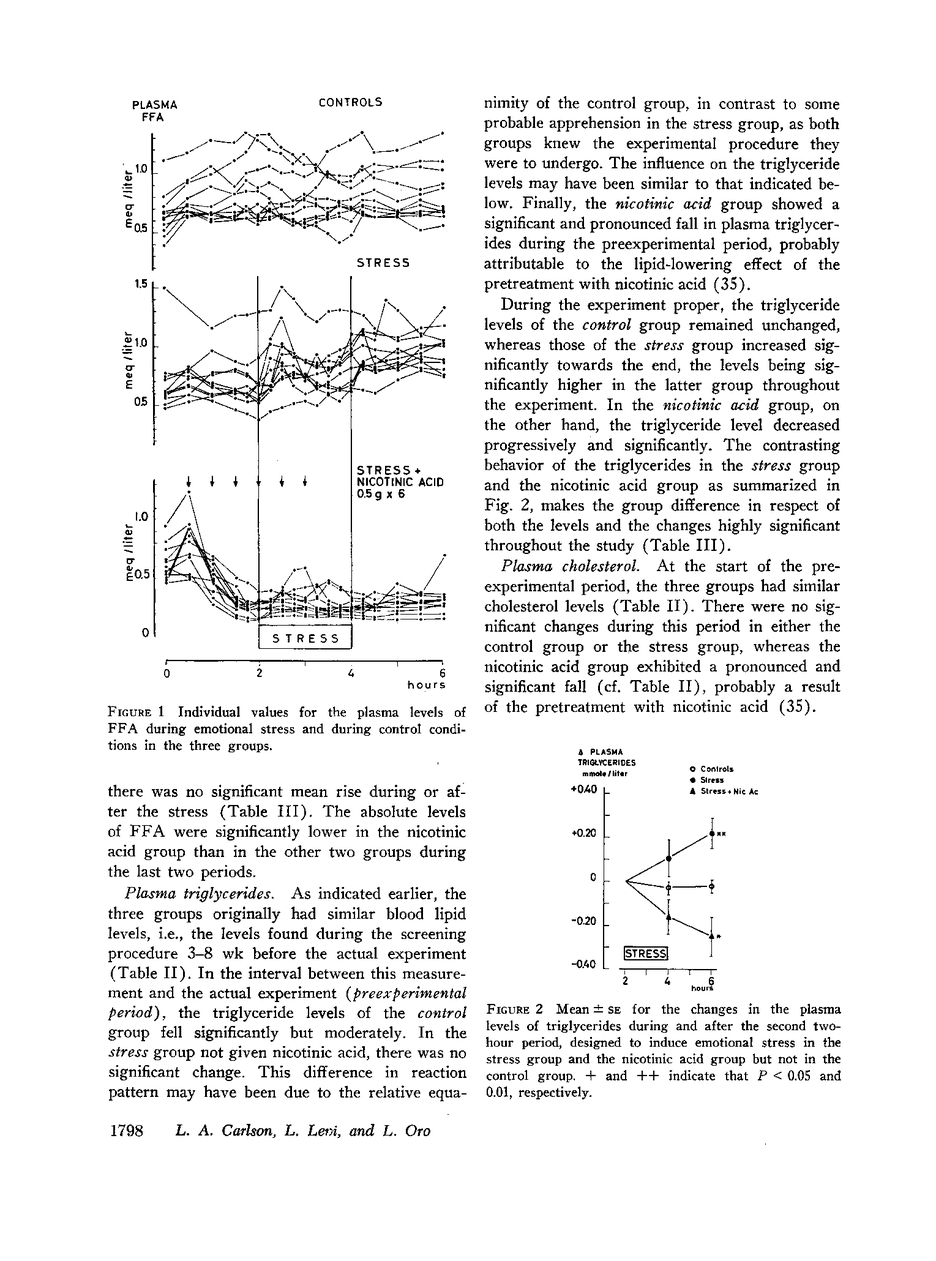 33 male volunteers were studied in the morning after fasting overnight. 11 (the control group) were allowed to sit comfortably for three consecutive 2-hr periods, no stressors or treatment being introduced. The remaining 22 were divided into two groups, each being exposed to standardized, emotional stressors during the second of the three 2-hr periods. The subjects in one of these groups were each given a total dose of 3 g of nicotinic acid during the first 3 hr of the experiment, whereas the other group received no treatment.