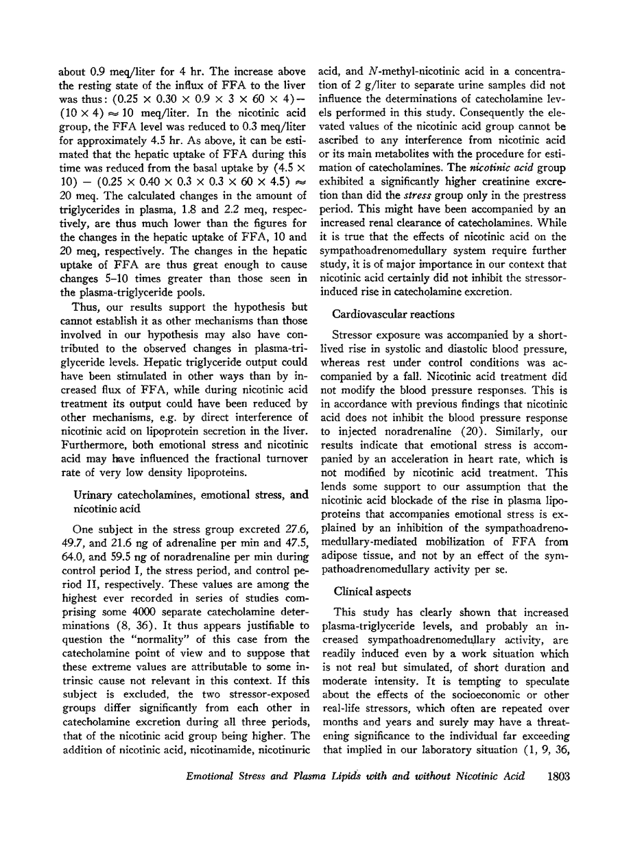 33 male volunteers were studied in the morning after fasting overnight. 11 (the control group) were allowed to sit comfortably for three consecutive 2-hr periods, no stressors or treatment being introduced. The remaining 22 were divided into two groups, each being exposed to standardized, emotional stressors during the second of the three 2-hr periods. The subjects in one of these groups were each given a total dose of 3 g of nicotinic acid during the first 3 hr of the experiment, whereas the other group received no treatment.