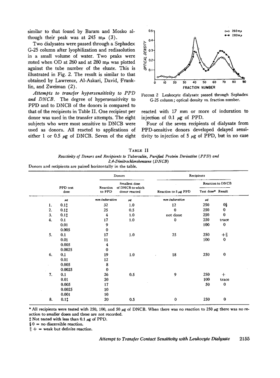 In humans delayed hypersensitivity to tuberculin and coccidiodin can be transferred from a skin-test positive donor to a previously nonreactive recipient with a dialyzable fraction of donor peripheral leukocytes. The mechanism by which transfer is effected by this relatively low molecular weight material is unknown. Should transfer with dialysate be accomplished with hypersensitivity to low molecular weight artificial antigens, further characterization of “transfer factor” might be facilitated.