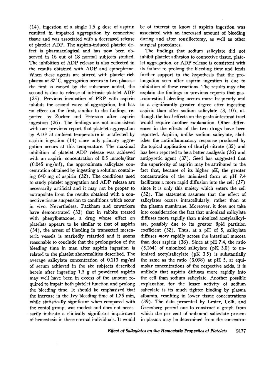 Ingestion of 1.5 g of aspirin, but not of sodium salicylate, produced a significant prolongation of the bleeding time in six normal male subjects when compared with the effects of a placebo. Similar differences in the effect of the two drugs on platelets was also observed. Aspirin ingestion resulted in impaired platelet aggregation by connective tissue and was associated with a decreased release of platelet adenosine diphosphate (ADP); sodium salicylate had no effect on these values. In vitro, incubation of platelet-rich plasma with an optimum aspirin concentration of 0.50 mmole/liter (0.045 mg/ml) inhibited both the adhesion of platelets to connective tissue and the release of ADP as well as the secondary wave of platelet aggregation produced with ADP or epinephrine; sodium salicylate had no effect on these reactions, which were also normal in patients with von Willebrand's disease. The inhibitory effect produced by ingesting a single 1.8 g dose of aspirin was detectable for 4-7 days at which time salicylate was no longer detectable in the blood, which suggested an irreversible effect on the platelet. Aspirin also inhibited the release of platelet adenosine triphosphate (ATP), but had no effect on the platelet surface charge, available platelet ATP or ADP, or the destruction of ADP by plasma ADPase. These studies lend further support to the hypothesis that ingestion of aspirin, in contrast to sodium salicylate, prolongs the bleeding time by inhibiting the release of platelet ADP, perhaps reflecting the findings in other cell systems which suggest that aspirin alters membrane permeability.
