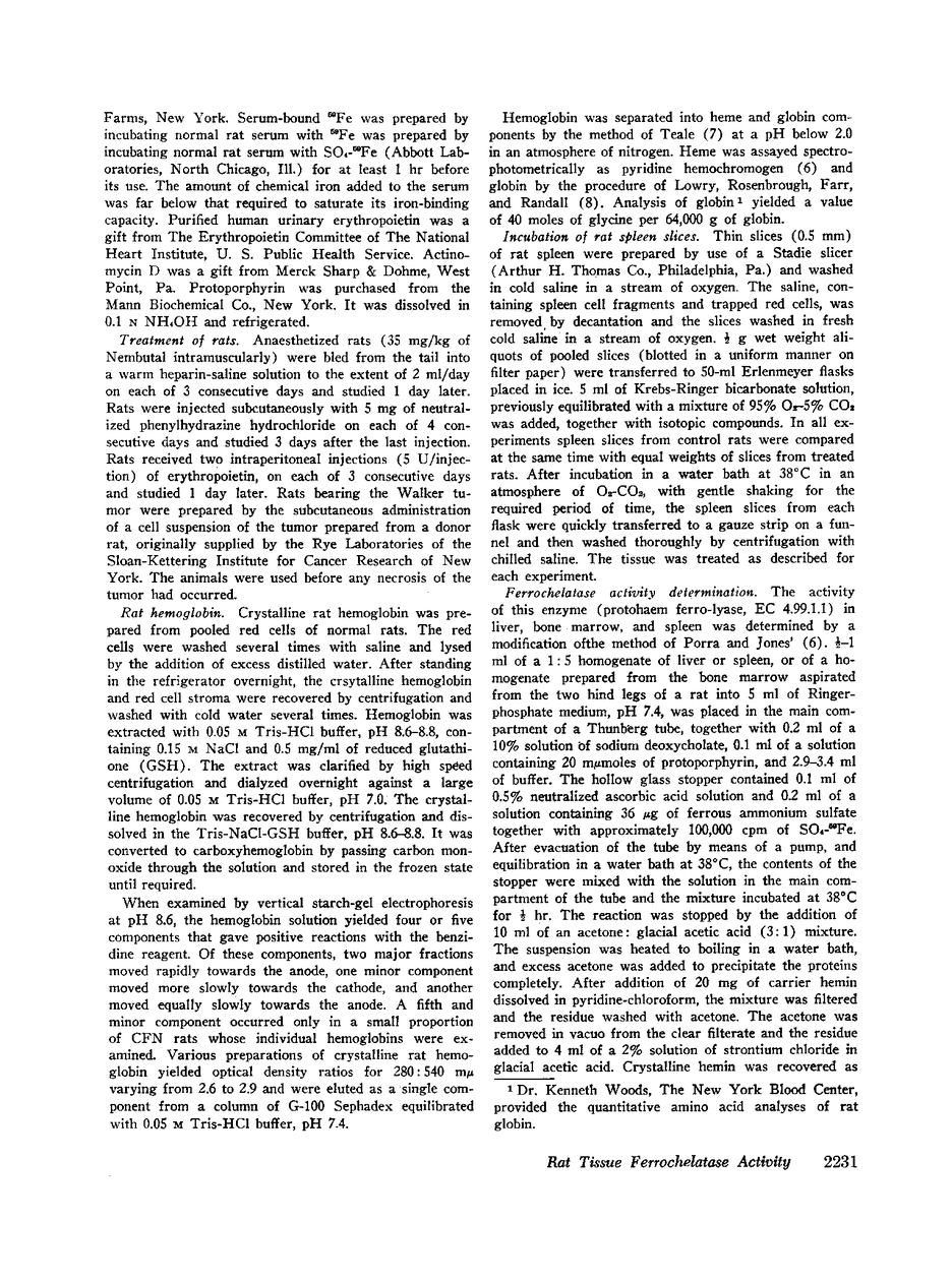 Assay of the enzyme ferrochelatase in marrow, liver, spleen, and red cells has been employed to assess the extent of erythropoietic stimulation in animals bearing the Walker 256 carcinosarcoma and in rats treated by administration of phenylhydrazine, cobalt chloride, human urinary erythropoietin, or chronic blood loss. In all instances, the spleen sustains the most marked increase of ferrochelatase activity, per gram of tissue. Spleen erythropoietic activity stimulation was confirmed by quantitative measurements in respiring slices of 59Fe and 14C incorporation into hemoglobin and ferritin. Increased spleen ferrochelatase activity in cobalt chloride-treated rats is prevented by actinomycin D, indicating that stimulated synthesis of the enzyme is associated with the metabolism of RNA.