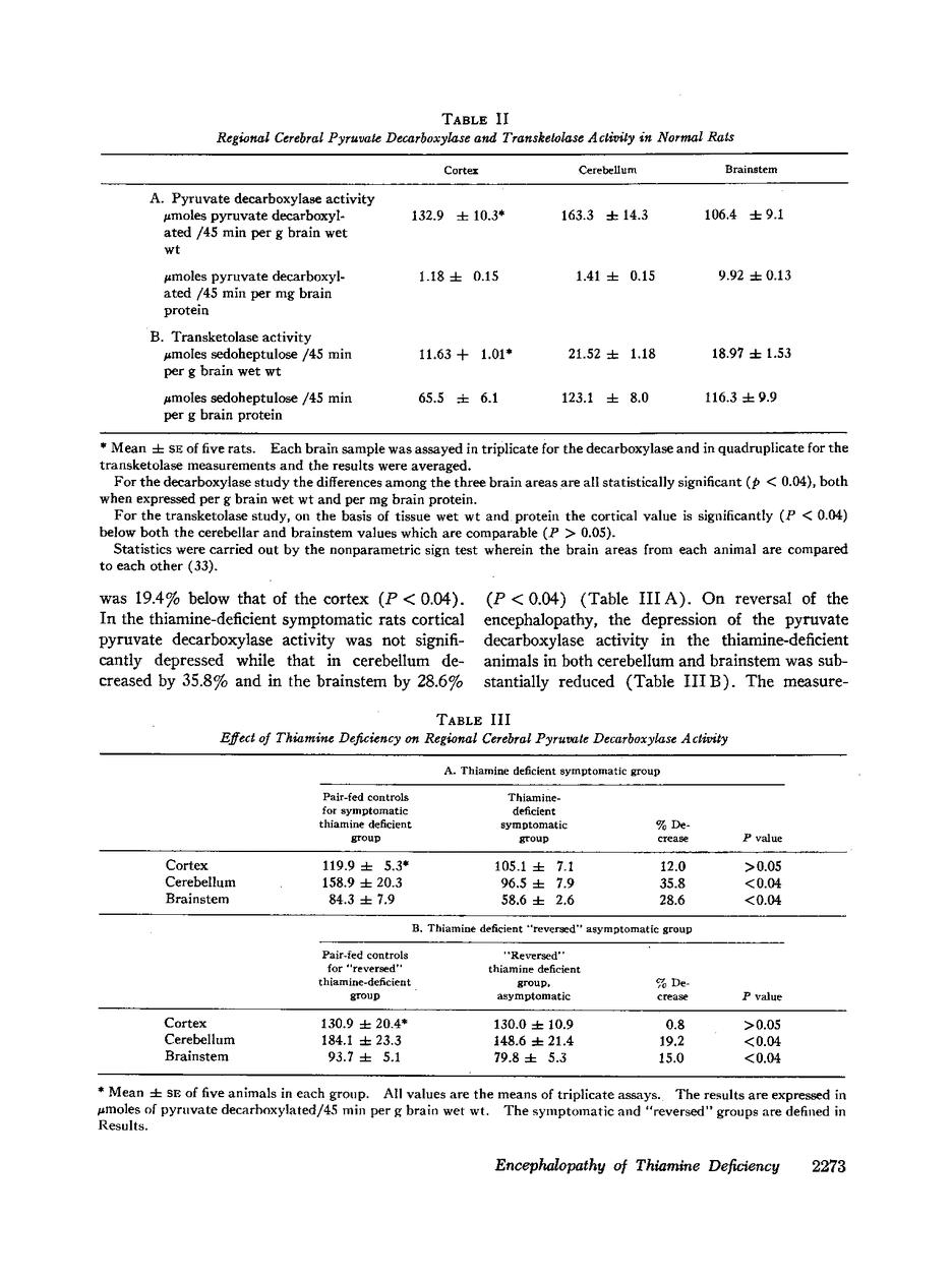 Thiamine-deficient encephalopathy is characterized by morphologic lesions in the brainstem and less extensively in the cerebellum, but the early neurologic signs reverse rapidly and fully with thiamine, indicating a metabolic disorder. The suggested causal mechanisms of the encephalopathy involve two thiamine-dependent enzymes: (a) impairment of pyruvate decarboxylase activity with decreased cerebral energy (ATP) synthesis, and (b) reduction of transketolase activity with possible impairment of the hexose monophosphate shunt and subsequent decrease in NADPH formation. The latter may be important in maintaining glutathione in a reduced form (GSH), which apparently functions by keeping enzymes in a reduced (active) conformation.
