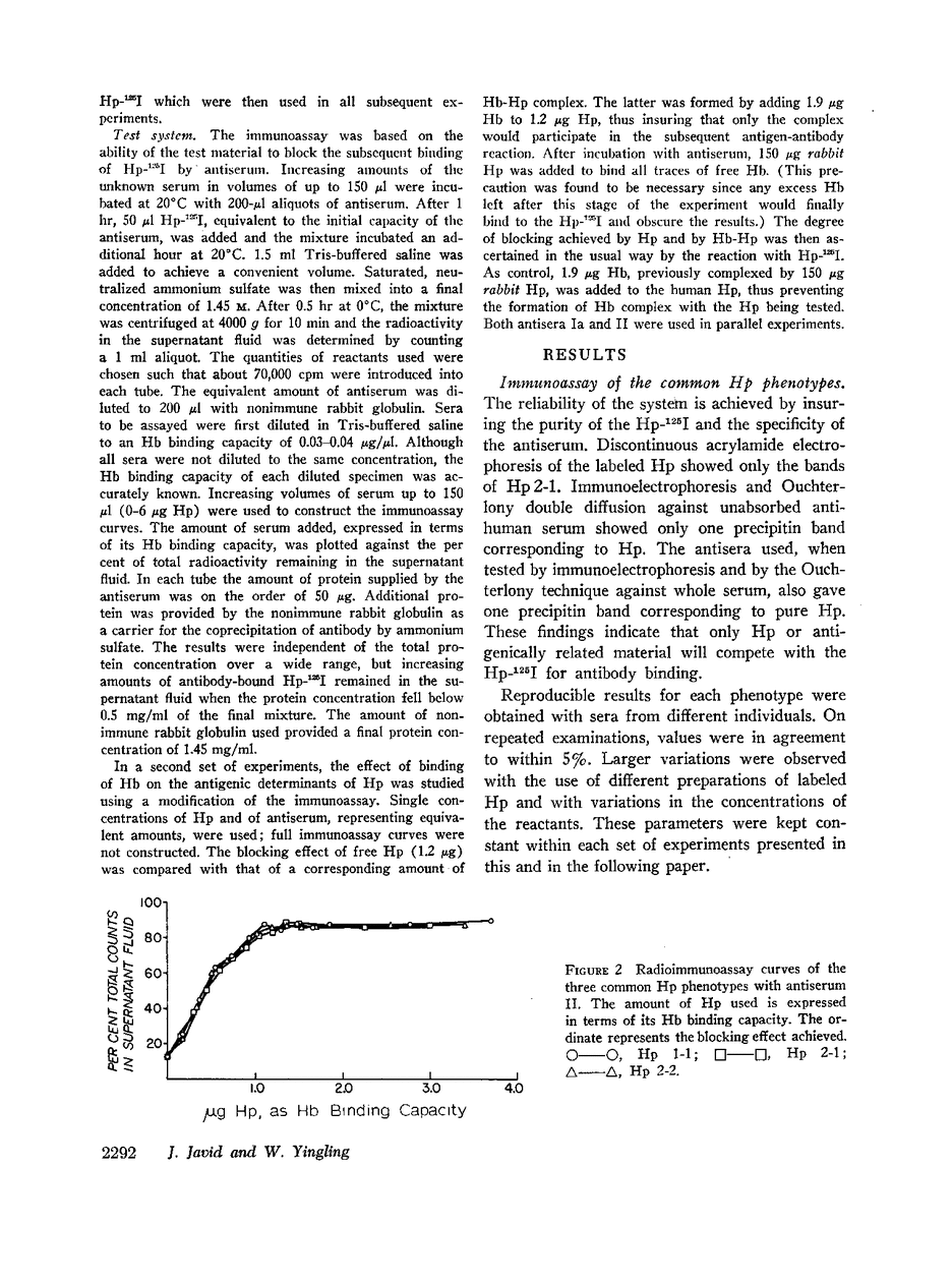 The various antigenic determinants of serum haptoglobins (Hp) may be studied semiquantitatively in a radioimmunoassay system. Using three antisera of overlapping specificities, we constructed an antigenic model of the various Hp phenotypes comprising four distinct determinants. This adds a new determinant, situated near the hemoglobin binding site, to the three determinants reported in the literature.