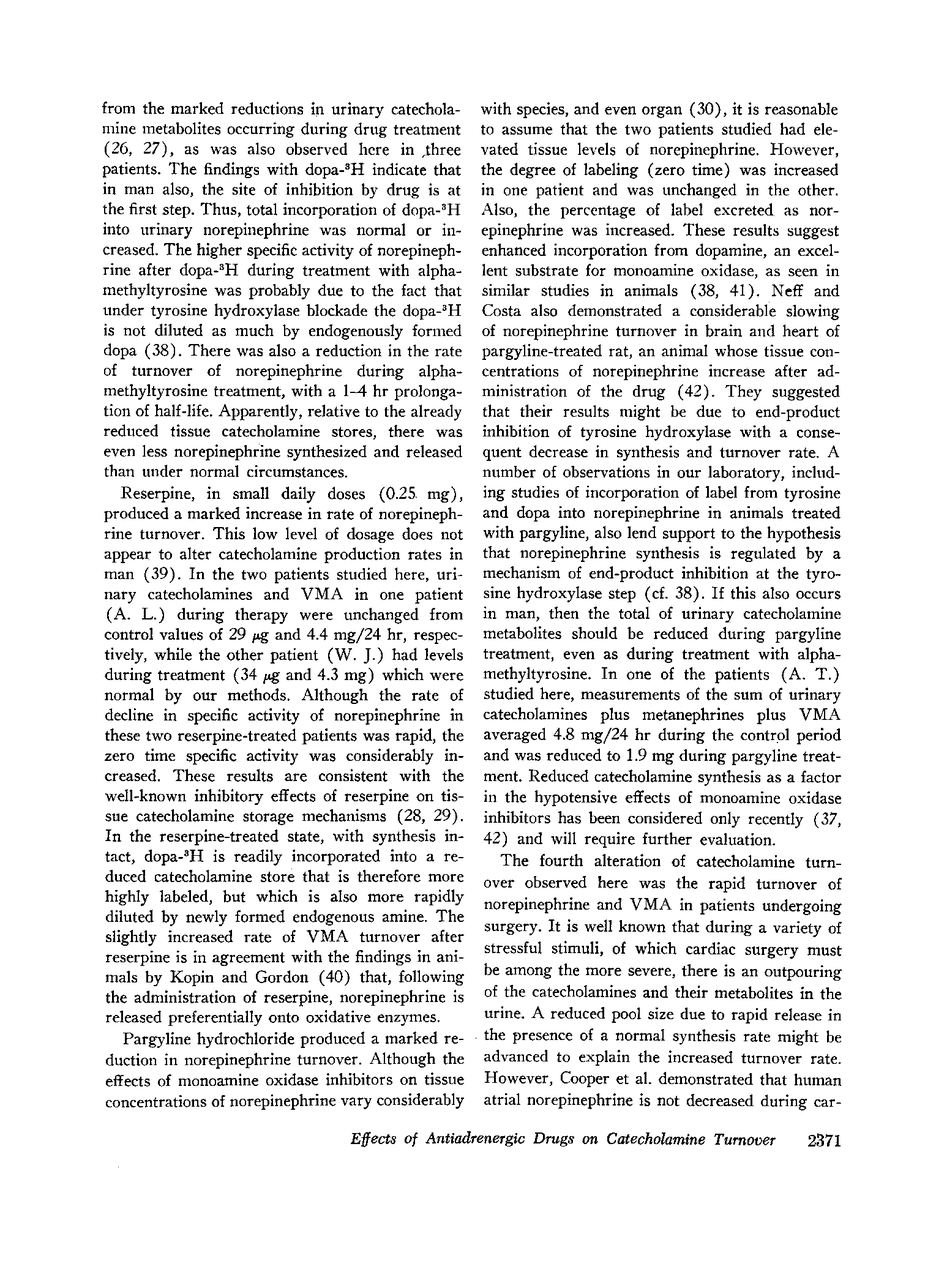 Intravenous administration of tritium-labeled 3,4-dihydroxyphenylalanine (dopa) to human subjects resulted in the labeling of endogenous catecholamines and vanillylmandelic acid (VMA). Determination of the changes in specific activity of these compounds with time in fractional collections of urine and in cardiac biopsies from patients undergoing corrective cardiac surgery permitted estimation of apparent turnover rates. The average half-time of the exponential decline in specific activity of labeled urinary norepinephrine was about 8 hr and that of VMA was 11-16 hr in five normal subjects. No significant differences from normal were observed in eight patients with essential hypertension. The average half-life of norepinephrine was only 5 hr in cardiac patients undergoing surgery, and the levels and rate of decline of cardiac norepinephrine specific activity correlated well with the exponential phase of the urinary disappearance curve. There were significant effects of treatment with alpha-methyltyrosine, reserpine, and pargyline hydrochloride on the labeling and apparent turnover rates of norepinephrine and VMA; the effects noted were consistent with known actions of these three drugs. It is suggested that the technique used is a suitable means of assessing “over-all” catecholamine metabolism in man, particulary if combined with quantitative assay of urinary catecholamine metabolites.