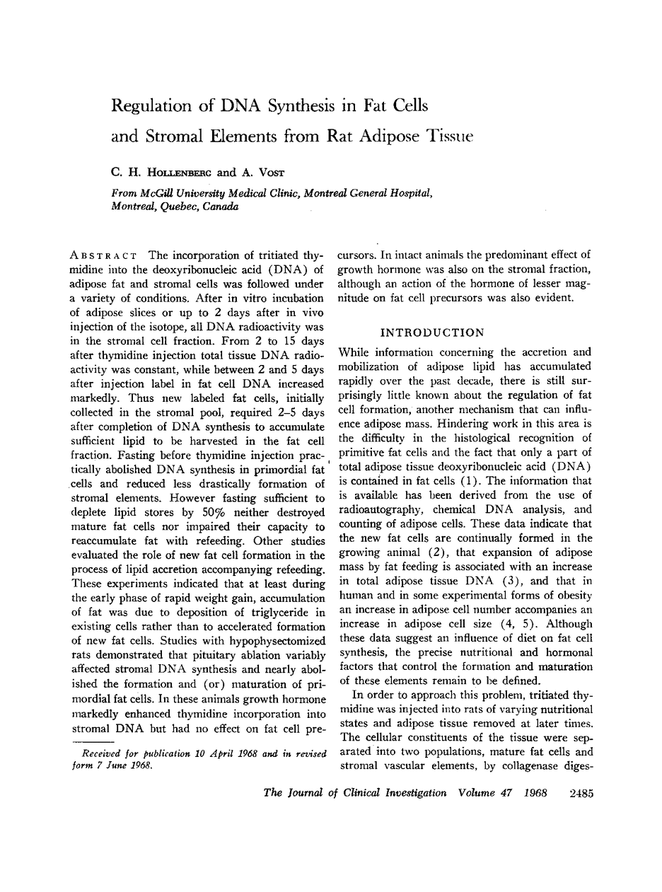 The incorporation of tritiated thymidine into the deoxyribonucleic acid (DNA) of adipose fat and stromal cells was followed under a variety of conditions. After in vitro incubation of adipose slices or up to 2 days after in vivo injection of the isotope, all DNA radioactivity was in the stromal cell fraction. From 2 to 15 days after thymidine injection total tissue DNA radioactivity was constant, while between 2 and 5 days after injection label in fat cell DNA increased markedly. Thus new labeled fat cells, initially collected in the stromal pool, required 2-5 days after completion of DNA synthesis to accumulate sufficient lipid to be harvested in the fat cell fraction. Fasting before thymidine injection practically abolished DNA synthesis in primordial fat cells and reduced less drastically formation of stromal elements. However fasting sufficient to deplete lipid stores by 50% neither destroyed mature fat cells nor impaired their capacity to reaccumulate fat with refeeding. Other studies evaluated the role of new fat cell formation in the process of lipid accretion accompanying refeeding. These experiments indicated that at least during the early phase of rapid weight gain, accumulation of fat was due to deposition of triglyceride in existing cells rather than to accelerated formation of new fat cells. Studies with hypophysectomized rats demonstrated that pituitary ablation variably affected stromal DNA synthesis and nearly abolished the formation and (or) maturation of primordial fat cells. In these animals growth hormone markedly enhanced thymidine incorporation into stromal DNA but had no effect on fat cell precursors. In intact animals the predominant effect of growth hormone was also on the stromal fraction, although an action of the hormone of lesser magnitude on fat cell precursors was also evident.