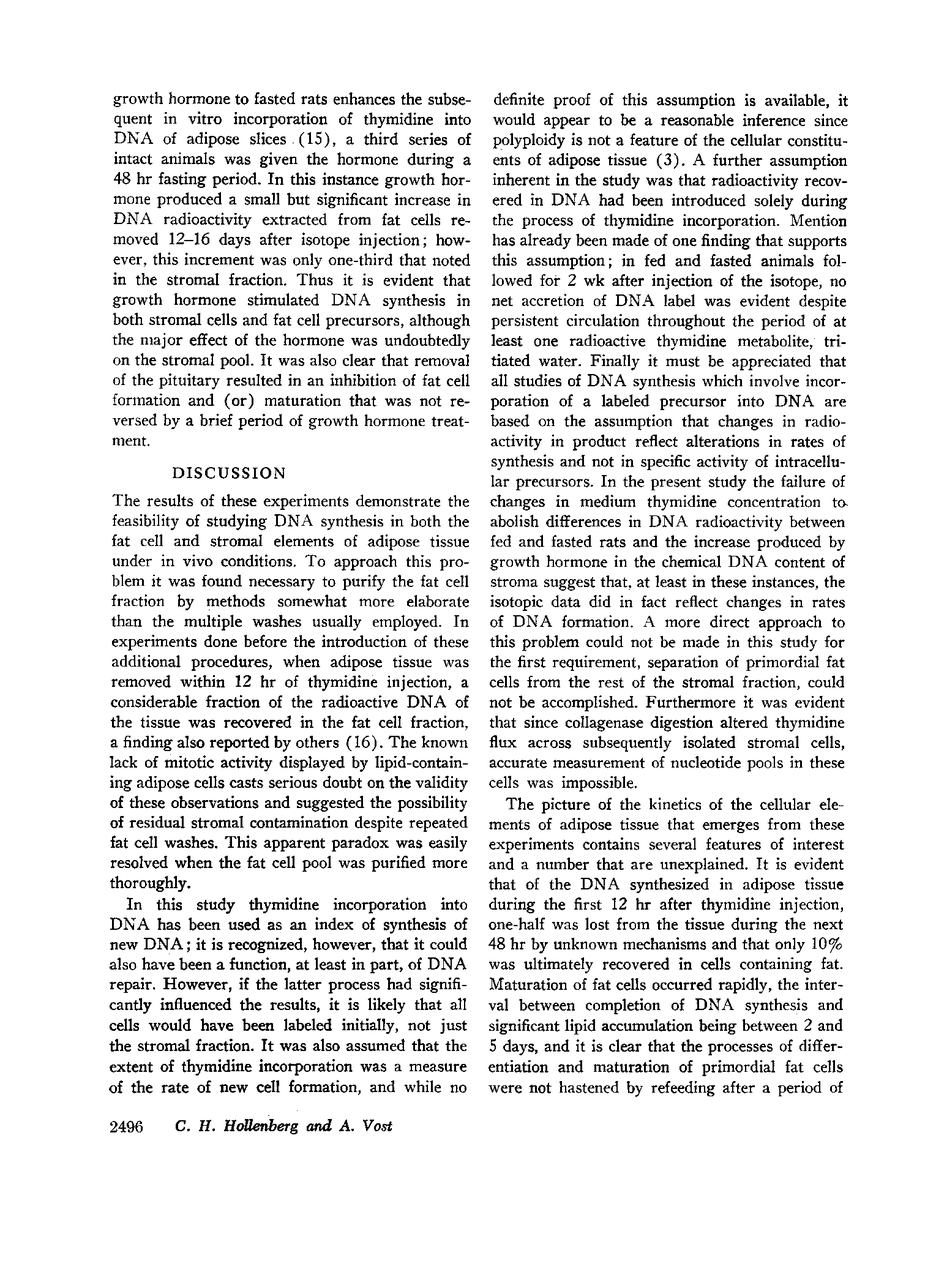 The incorporation of tritiated thymidine into the deoxyribonucleic acid (DNA) of adipose fat and stromal cells was followed under a variety of conditions. After in vitro incubation of adipose slices or up to 2 days after in vivo injection of the isotope, all DNA radioactivity was in the stromal cell fraction. From 2 to 15 days after thymidine injection total tissue DNA radioactivity was constant, while between 2 and 5 days after injection label in fat cell DNA increased markedly. Thus new labeled fat cells, initially collected in the stromal pool, required 2-5 days after completion of DNA synthesis to accumulate sufficient lipid to be harvested in the fat cell fraction. Fasting before thymidine injection practically abolished DNA synthesis in primordial fat cells and reduced less drastically formation of stromal elements. However fasting sufficient to deplete lipid stores by 50% neither destroyed mature fat cells nor impaired their capacity to reaccumulate fat with refeeding. Other studies evaluated the role of new fat cell formation in the process of lipid accretion accompanying refeeding. These experiments indicated that at least during the early phase of rapid weight gain, accumulation of fat was due to deposition of triglyceride in existing cells rather than to accelerated formation of new fat cells. Studies with hypophysectomized rats demonstrated that pituitary ablation variably affected stromal DNA synthesis and nearly abolished the formation and (or) maturation of primordial fat cells. In these animals growth hormone markedly enhanced thymidine incorporation into stromal DNA but had no effect on fat cell precursors. In intact animals the predominant effect of growth hormone was also on the stromal fraction, although an action of the hormone of lesser magnitude on fat cell precursors was also evident.