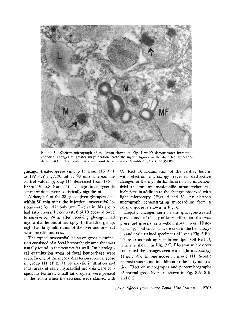 The toxic effects associated with rapid lipid mobilization and a high plasma free fatty acid (FFA) concentration produced by glucagon were evaluated. Glucagon (0.5 mg/kg of body wt) was injected intravenously into nonfasting geese. The geese developed rapid respirations and high plasma FFA levels within 15 min after the glucagon injection; three of eleven died. Control geese, injected with saline, did not exhibit toxic signs. Peak FFA concentrations developed 15 min after glucagon and high levels persisted for over 90 min. Geese injected with glucagon frequently developed electrocardiographic abnormalities that included supraventricular tachycardia, premature ventricular contractions, and signs of myocardial ischemia. Light and electron microscopy revealed acute myocardial degeneration and fatty infiltration of the liver. The increase in plasma FFA concentrations and toxic effects were not prevented by pretreatment with nicotinic acid or propranolol.