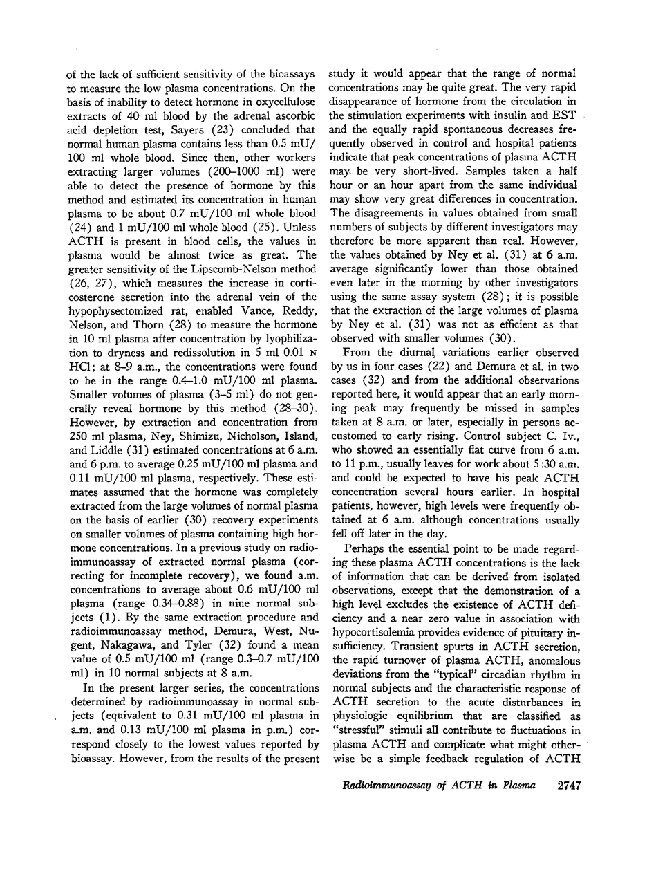 Techniques are described in detail for a radioimmunoassay of plasma adrenocorticotropin (ACTH) that is capable of detecting hormone in unextracted normal human plasma at 1:5 dilution under the conditions described. The sensitivity of the assay is at the level of 1 μμg/ml (equivalent to 0.014 mU/100 ml).