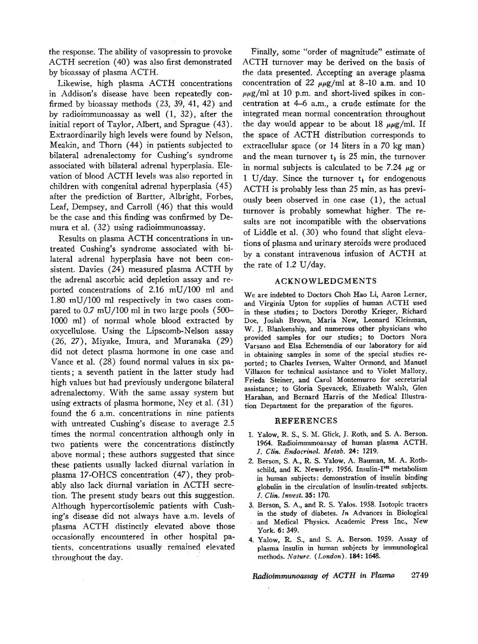 Techniques are described in detail for a radioimmunoassay of plasma adrenocorticotropin (ACTH) that is capable of detecting hormone in unextracted normal human plasma at 1:5 dilution under the conditions described. The sensitivity of the assay is at the level of 1 μμg/ml (equivalent to 0.014 mU/100 ml).