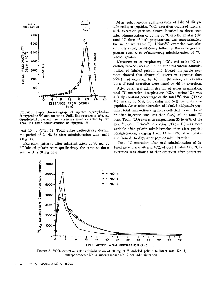 To determine the quantitative relationship of urinary hydroxyproline peptide excretion to collagen breakdown, known quantities of radioactive hydroxyproline peptides were administered to unlabeled animals and excertion of radioactivity in respiratory carbon dioxide, urine, and feces was measured. The major routes of excretion of collagen peptide metabolites were respiratory carbon dioxide (75%) and urine, as hydroxyproline-containing peptides (25%).