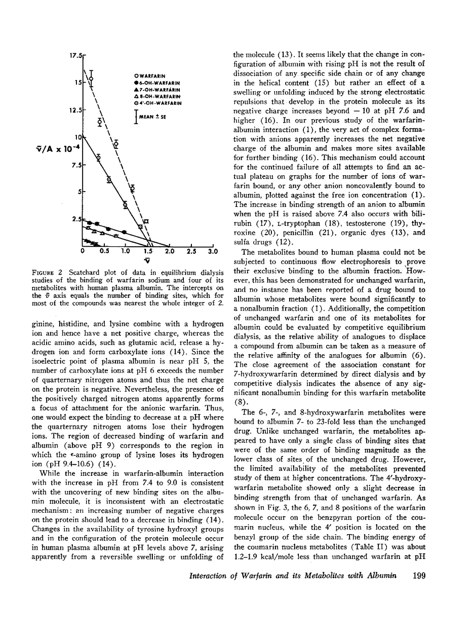 The interaction of the anticoagulant drug warfarin and its metabolites with human plasma albumin was studied by equilibrium dialysis. A 20-fold variation of buffer ionic strength (0.017-0.340) caused no significant change in the warfarin association constant. But the binding strength rose significantly as the pH was increased from 6.0 to 9.0 and then declined at pH 10.0. The 6-, 7-, and 8-hydroxywarfarin metabolites showed a 7- to 23-fold reduction in binding strength at pH 10.0. These data indicate that the molecular basis of the interaction is nonelectrostatic and that the introduction of polar hydroxyl groups on the coumarin nucleus by metabolism reduces its hydrophobic binding surface. The interaction was markedly exothermic and showed a positive entropy (increased molecular disorder), which suggests cooperative hydrogen and hydrophobic bonding as the molecular basis for the binding of warfarin to albumin.