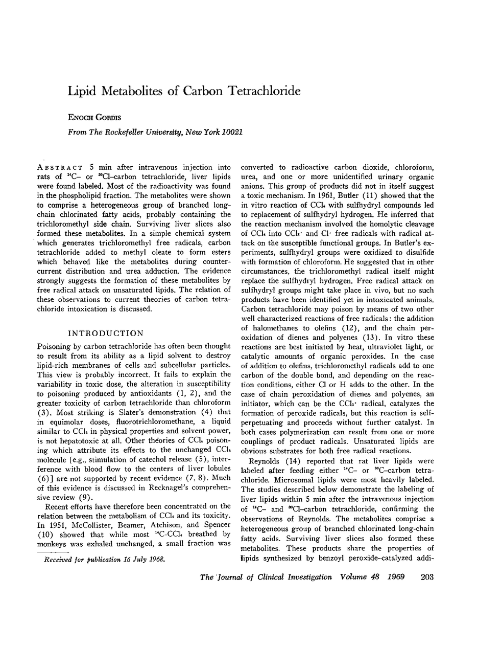 5 min after intravenous injection into rats of 14C- or 36Cl-carbon tetrachloride, liver lipids were found labeled. Most of the radioactivity was found in the phospholipid fraction. The metabolites were shown to comprise a heterogeneous group of branched long-chain chlorinated fatty acids, probably containing the trichloromethyl side chain. Surviving liver slices also formed these metabolites. In a simple chemical system which generates trichloromethyl free radicals, carbon tetrachloride added to methyl oleate to form esters which behaved like the metabolites during counter-current distribution and urea adduction. The evidence strongly suggests the formation of these metabolites by free radical attack on unsaturated lipids. The relation of these observations to current theories of carbon tetrachloride intoxication is discussed.