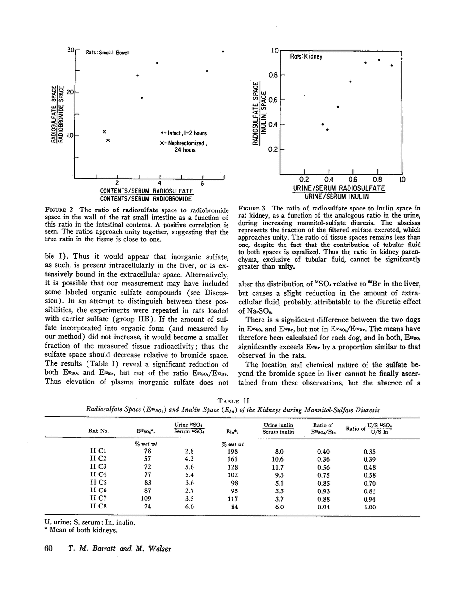 Radiosulfate, 35SO4, and radiobromide, 82Br, were administered simultaneously to rats and dogs. In rats, the apparent volume of distribution of 82Br averaged 30% of body weight and was constant between 0.5 and 35 hr after injection. The apparent volume of distribution of 35SO4, corrected for urinary loss, increased by 6% body weight/hr: the extrapolated volume at zero time was 88% of bromide space. Analysis of individual tissues and carcasses for 82Br and inorganic 35SO4 showed that equilibration of both isotopes in several organs and in the whole carcass was rapidly achieved within 1 to 2 hr: no further increase in measured spaces occurred in 24 hr. The carcass inorganic sulfate space was 92%±2% of the bromide space in intact rats, and showed no increase with time. However, a progressively greater fraction of the injected 35SO4 was not recovered, owing to metabolic alteration. In eviscerated rats, the inorganic sulfate space was a smaller and much more constant fraction (79.8% ±0.4%) of the bromide space, showing that at least 20% of body bromide (and hence chloride) is nonextracellular. The viscera chiefly responsible for the higher ratio of spaces in the intact animal were the liver, small bowel, and kidney. In the last two organs, excess inorganic 35SO4 (beyond the bromide space) was attributable to trapped transcellular fluid in which sulfate had been concentrated more than chloride (or bromide). Excess sulfate in liver and cartilage could not be explained in this manner: the results suggest passive binding of sulfate, but could reflect active cell uptake in these tissues. No excess sulfate was found in skin or tail. The implications of these observations with respect to the distribution of body chloride and the measurement of extracellular space are discussed. The extracellular volume of the rat is estimated to be 24% of body weight.
