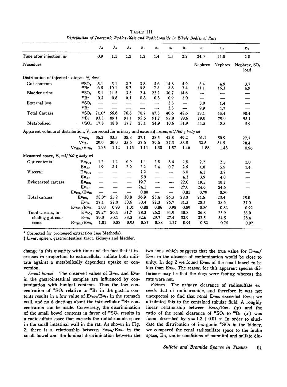 Radiosulfate, 35SO4, and radiobromide, 82Br, were administered simultaneously to rats and dogs. In rats, the apparent volume of distribution of 82Br averaged 30% of body weight and was constant between 0.5 and 35 hr after injection. The apparent volume of distribution of 35SO4, corrected for urinary loss, increased by 6% body weight/hr: the extrapolated volume at zero time was 88% of bromide space. Analysis of individual tissues and carcasses for 82Br and inorganic 35SO4 showed that equilibration of both isotopes in several organs and in the whole carcass was rapidly achieved within 1 to 2 hr: no further increase in measured spaces occurred in 24 hr. The carcass inorganic sulfate space was 92%±2% of the bromide space in intact rats, and showed no increase with time. However, a progressively greater fraction of the injected 35SO4 was not recovered, owing to metabolic alteration. In eviscerated rats, the inorganic sulfate space was a smaller and much more constant fraction (79.8% ±0.4%) of the bromide space, showing that at least 20% of body bromide (and hence chloride) is nonextracellular. The viscera chiefly responsible for the higher ratio of spaces in the intact animal were the liver, small bowel, and kidney. In the last two organs, excess inorganic 35SO4 (beyond the bromide space) was attributable to trapped transcellular fluid in which sulfate had been concentrated more than chloride (or bromide). Excess sulfate in liver and cartilage could not be explained in this manner: the results suggest passive binding of sulfate, but could reflect active cell uptake in these tissues. No excess sulfate was found in skin or tail. The implications of these observations with respect to the distribution of body chloride and the measurement of extracellular space are discussed. The extracellular volume of the rat is estimated to be 24% of body weight.