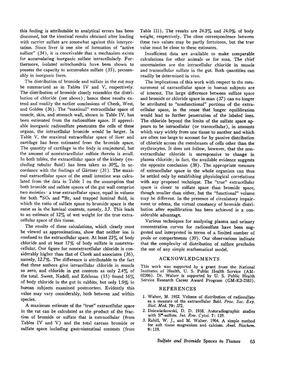 Radiosulfate, 35SO4, and radiobromide, 82Br, were administered simultaneously to rats and dogs. In rats, the apparent volume of distribution of 82Br averaged 30% of body weight and was constant between 0.5 and 35 hr after injection. The apparent volume of distribution of 35SO4, corrected for urinary loss, increased by 6% body weight/hr: the extrapolated volume at zero time was 88% of bromide space. Analysis of individual tissues and carcasses for 82Br and inorganic 35SO4 showed that equilibration of both isotopes in several organs and in the whole carcass was rapidly achieved within 1 to 2 hr: no further increase in measured spaces occurred in 24 hr. The carcass inorganic sulfate space was 92%±2% of the bromide space in intact rats, and showed no increase with time. However, a progressively greater fraction of the injected 35SO4 was not recovered, owing to metabolic alteration. In eviscerated rats, the inorganic sulfate space was a smaller and much more constant fraction (79.8% ±0.4%) of the bromide space, showing that at least 20% of body bromide (and hence chloride) is nonextracellular. The viscera chiefly responsible for the higher ratio of spaces in the intact animal were the liver, small bowel, and kidney. In the last two organs, excess inorganic 35SO4 (beyond the bromide space) was attributable to trapped transcellular fluid in which sulfate had been concentrated more than chloride (or bromide). Excess sulfate in liver and cartilage could not be explained in this manner: the results suggest passive binding of sulfate, but could reflect active cell uptake in these tissues. No excess sulfate was found in skin or tail. The implications of these observations with respect to the distribution of body chloride and the measurement of extracellular space are discussed. The extracellular volume of the rat is estimated to be 24% of body weight.
