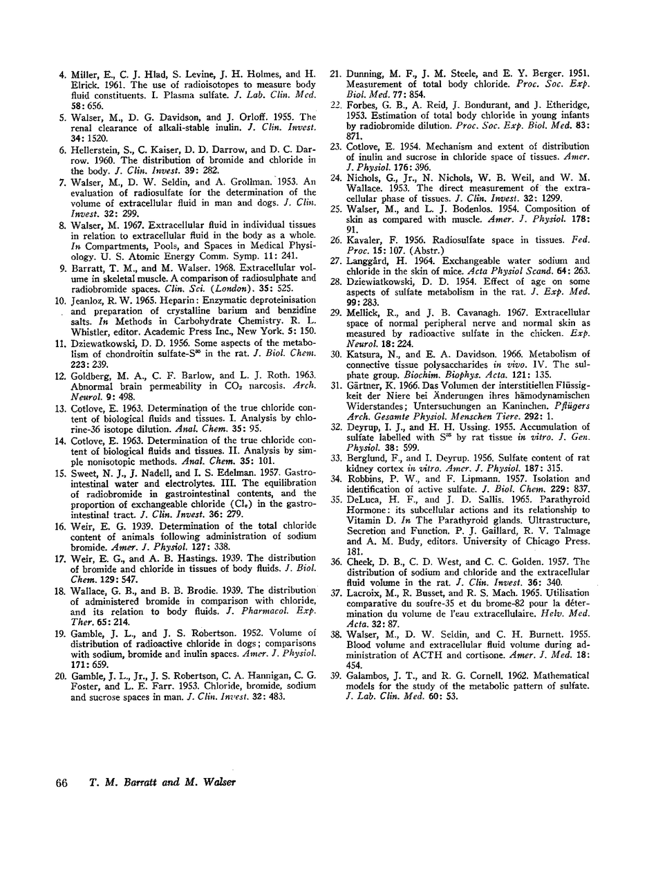 Radiosulfate, 35SO4, and radiobromide, 82Br, were administered simultaneously to rats and dogs. In rats, the apparent volume of distribution of 82Br averaged 30% of body weight and was constant between 0.5 and 35 hr after injection. The apparent volume of distribution of 35SO4, corrected for urinary loss, increased by 6% body weight/hr: the extrapolated volume at zero time was 88% of bromide space. Analysis of individual tissues and carcasses for 82Br and inorganic 35SO4 showed that equilibration of both isotopes in several organs and in the whole carcass was rapidly achieved within 1 to 2 hr: no further increase in measured spaces occurred in 24 hr. The carcass inorganic sulfate space was 92%±2% of the bromide space in intact rats, and showed no increase with time. However, a progressively greater fraction of the injected 35SO4 was not recovered, owing to metabolic alteration. In eviscerated rats, the inorganic sulfate space was a smaller and much more constant fraction (79.8% ±0.4%) of the bromide space, showing that at least 20% of body bromide (and hence chloride) is nonextracellular. The viscera chiefly responsible for the higher ratio of spaces in the intact animal were the liver, small bowel, and kidney. In the last two organs, excess inorganic 35SO4 (beyond the bromide space) was attributable to trapped transcellular fluid in which sulfate had been concentrated more than chloride (or bromide). Excess sulfate in liver and cartilage could not be explained in this manner: the results suggest passive binding of sulfate, but could reflect active cell uptake in these tissues. No excess sulfate was found in skin or tail. The implications of these observations with respect to the distribution of body chloride and the measurement of extracellular space are discussed. The extracellular volume of the rat is estimated to be 24% of body weight.