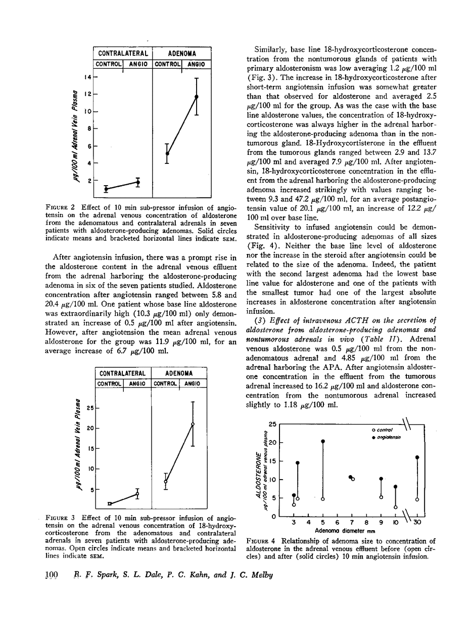 Angiotensin infusion evokes marked increases in aldosterone secretion in primary aldosteronism and little change in secondary aldosteronism. The low plasma renin activity of primary aldosteronism and the elevated plasma renin activity of secondary aldosteronism are thought to account for this differential response. The effect of angiotensin on aldosterone and 18-hydroxycorticosterone secretion was studied during adrenal vein catheterization in seven patients with primary aldosteronism (whose plasma renin activity had been elevated following spironolactone therapy), one hypertensive patient with normal plasma renin activity and normal aldosterone secretion, two patients with secondary aldosteronism who had elevated plasma renin activity, and one anephric patient whose plasma renin activity was 0. Adrenal venous aldosterone and 18-hydroxycorticosterone were measured before and after a ten min sub-pressor angiotensin infusion.