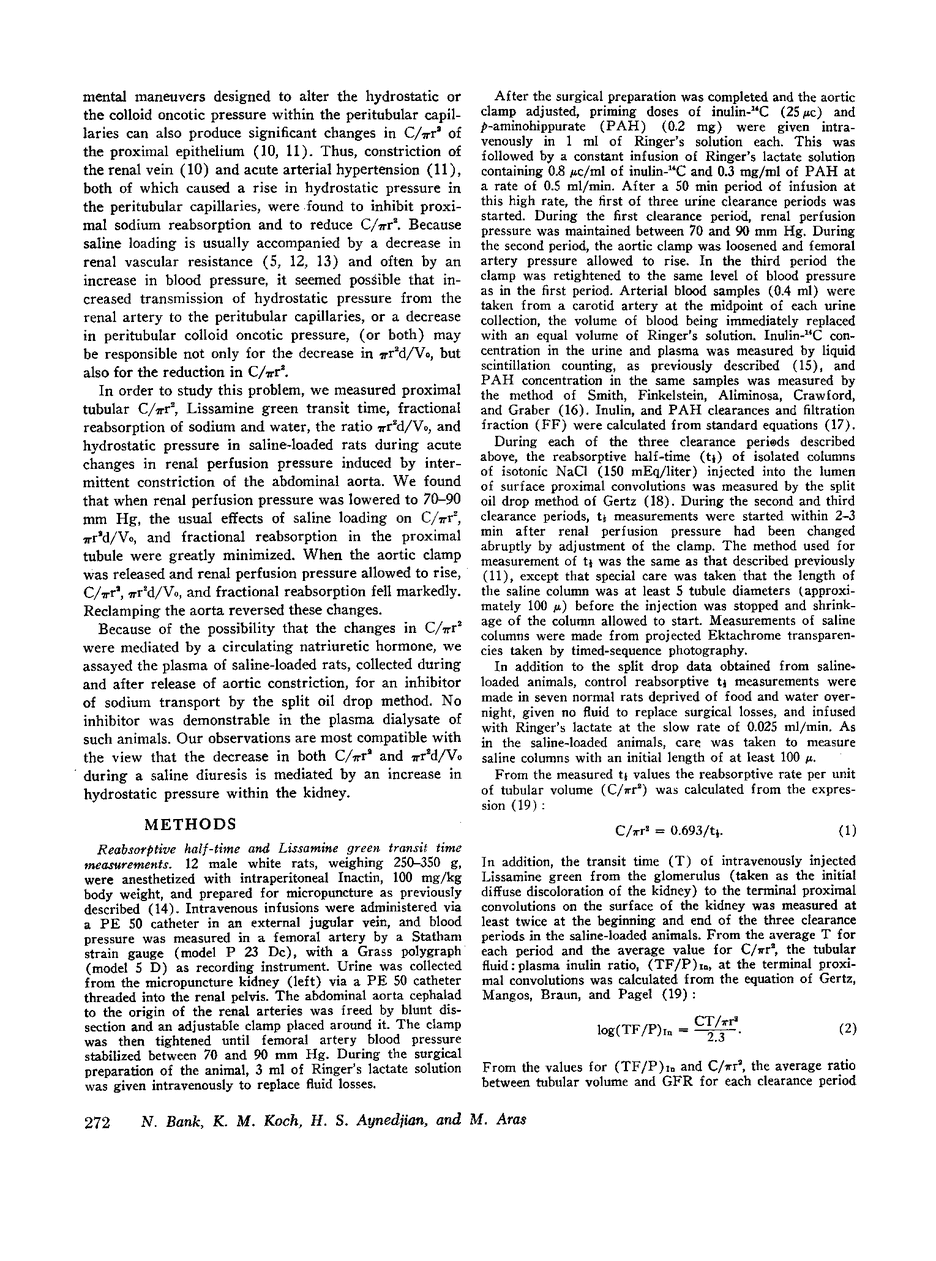 Rapid intravenous infusion of saline is known to suppress reabsorption of sodium and water in the proximal tubule. It has previously been shown that this suppression is accompanied by two changes which in combination might account for the over-all decrease in reabsorption: a reduction in the intrinsic reabsorptive capacity of the tubular epithelium (C/πr2) and a reduction in the ratio between tubular volume and GFR (πr2d/Vo). The present micropuncture experiments were carried out in order to study the possible role of altered peritubular physical forces (hydrostatic and colloid oncotic pressure) in mediating these two changes. Proximal tubular reabsorptive capacity, transit time, fractional reabsorption of sodium and water, πr2d/Vo, and intratubular hydrostatic pressure were measured in saline-loaded rats during acute changes in renal perfusion pressure induced by intermittent constriction of the abdominal aorta.