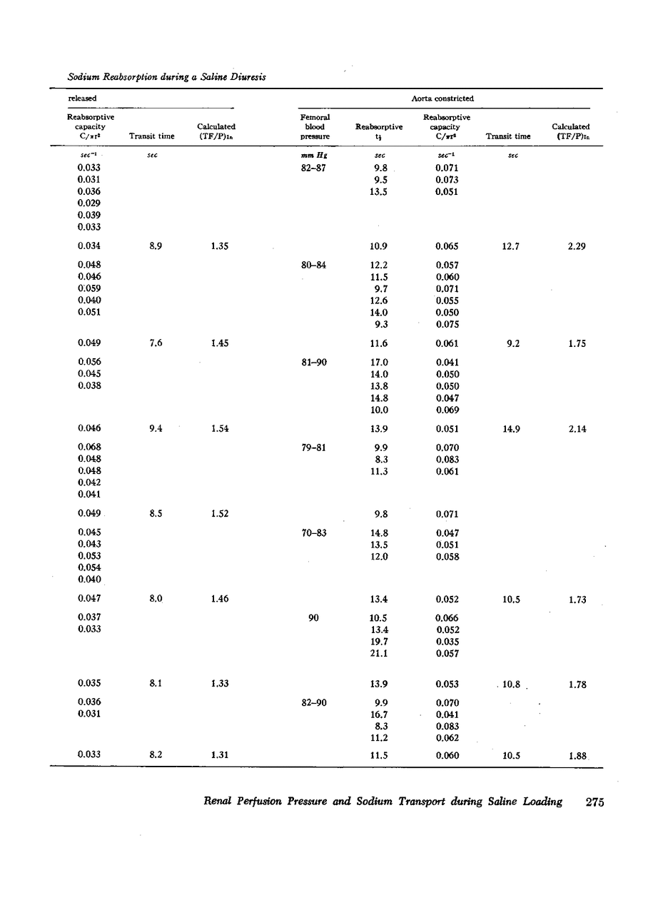 Rapid intravenous infusion of saline is known to suppress reabsorption of sodium and water in the proximal tubule. It has previously been shown that this suppression is accompanied by two changes which in combination might account for the over-all decrease in reabsorption: a reduction in the intrinsic reabsorptive capacity of the tubular epithelium (C/πr2) and a reduction in the ratio between tubular volume and GFR (πr2d/Vo). The present micropuncture experiments were carried out in order to study the possible role of altered peritubular physical forces (hydrostatic and colloid oncotic pressure) in mediating these two changes. Proximal tubular reabsorptive capacity, transit time, fractional reabsorption of sodium and water, πr2d/Vo, and intratubular hydrostatic pressure were measured in saline-loaded rats during acute changes in renal perfusion pressure induced by intermittent constriction of the abdominal aorta.