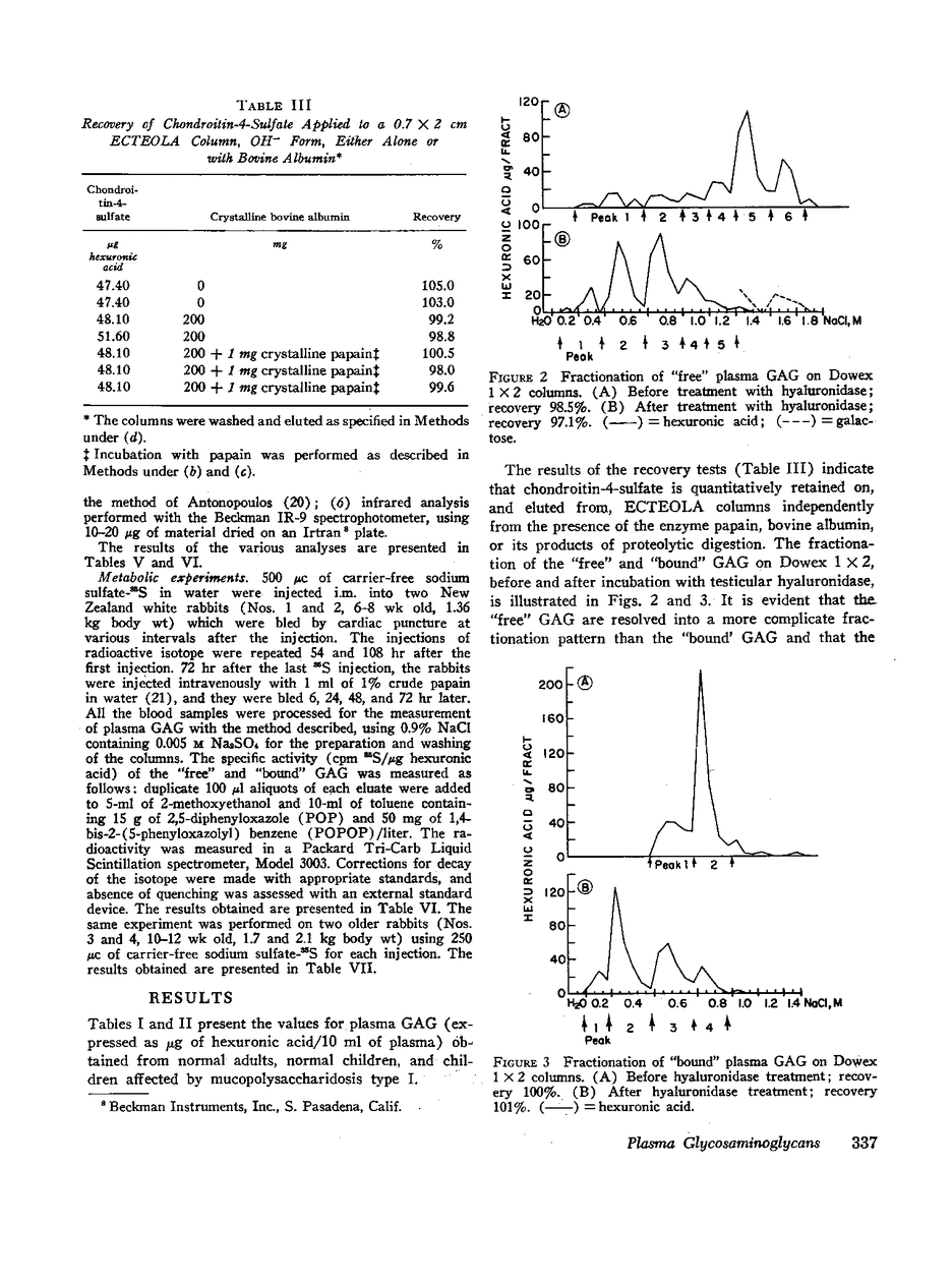A method is proposed for the measurement of glycosaminoglycans (GAG) on 5-10 ml of plasma. It is based on the adsorption of GAG on small ECTEOLA columns followed by measurement of the hexuronic acid in the NaCl eluates. Routine use of the method has indicated the presence of a GAG fraction that adsorbs readily on ECTEOLA (“free” GAG) and of another that adsorbs on it only after treatment with papain (“bound” GAG). “Free” and “bound” GAG have been measured in normal adults, normal children, and children affected by mucopolysaccharidosis type I; the results obtained are in good agreement with those previously reported in the literature.