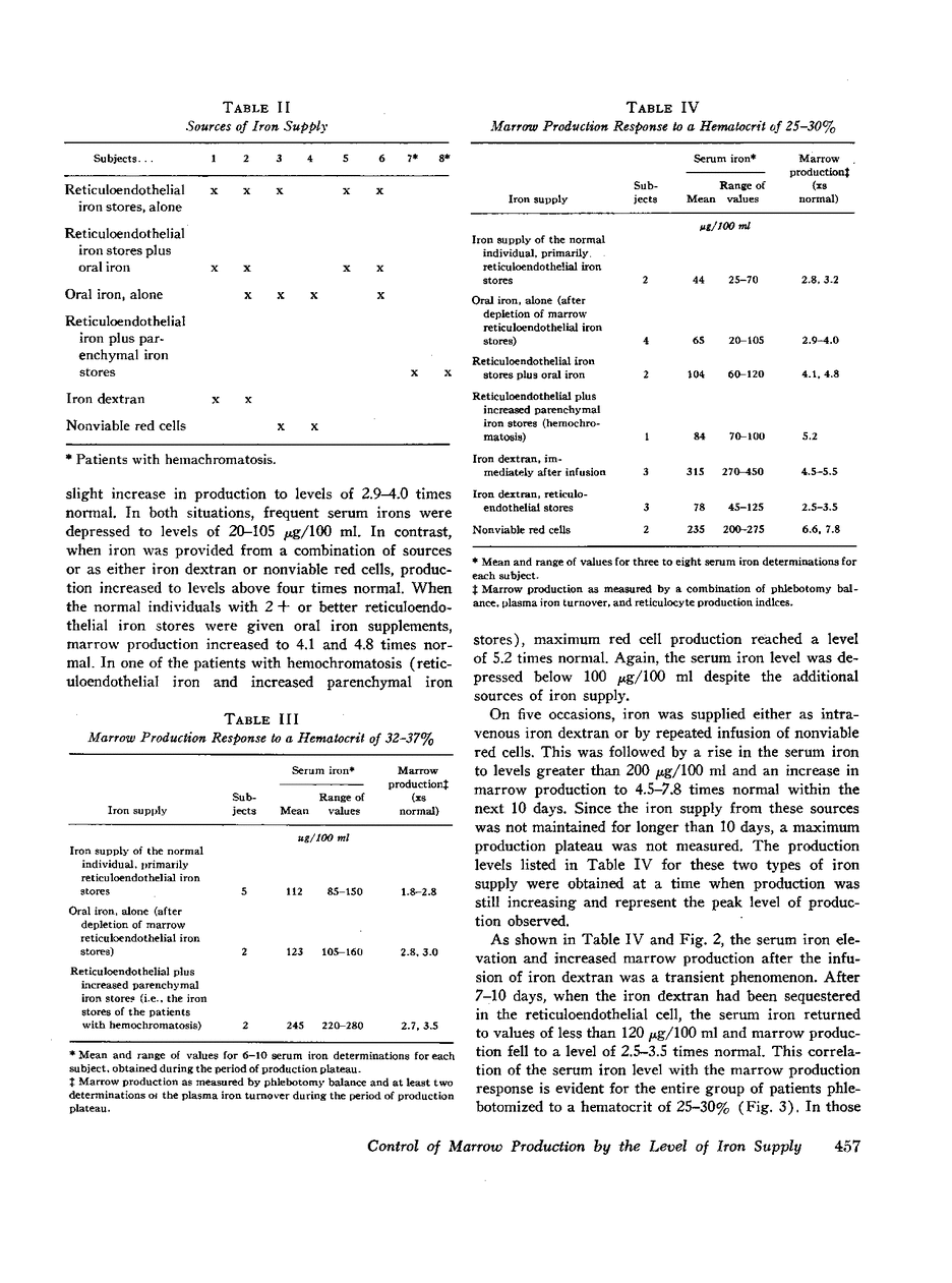 The level of erythroid marrow production varies widely in different erythropoietic disorders. In part, this reflects the level of erythropoietin stimulation as determined by the severity of the anemia. However, iron supply plays an equally important role in the control of erythropoiesis. As demonstrated in normal individuals subjected to prolonged periods of phlebotomy-induced anemia, the erythroid marrow will increase production by as little as twice to as much as eight times normal, depending on the iron supply available from different iron pools. Whereas the iron delivered from normal reticuloendothelial stores or orally administered iron is sufficient for a marrow production response of only two to three times normal, the increased iron supply from nonviable red cells, hemolysis, or iron dextran infusions permits marrow production to rise acutely to levels of four to eight times normal.