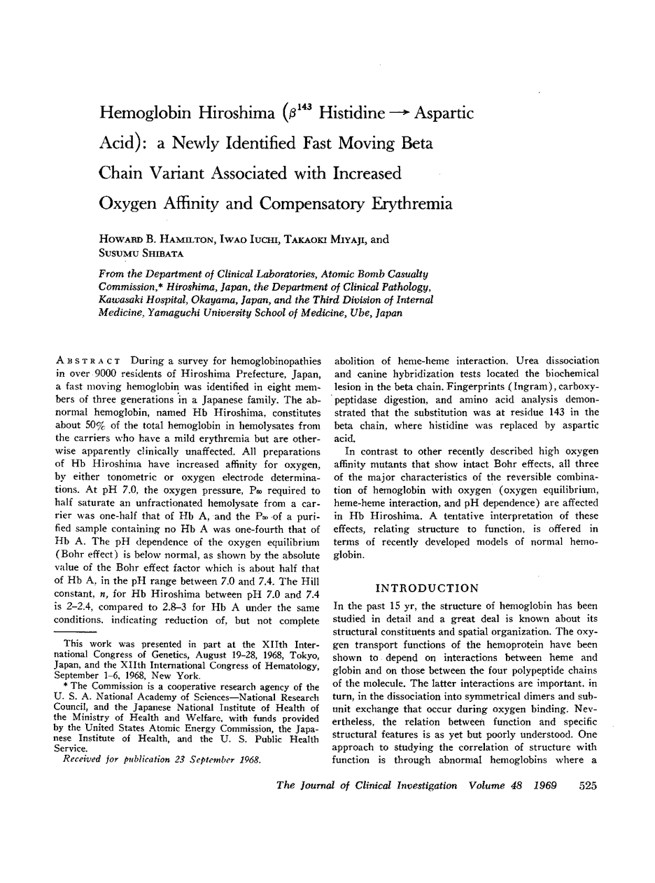 During a survey for hemoglobinopathies in over 9000 residents of Hiroshima Prefecture, Japan, a fast moving hemoglobin was identified in eight members of three generations in a Japanese family. The abnormal hemoglobin, named Hb Hiroshima, constitutes about 50% of the total hemoglobin in hemolysates from the carriers who have a mild erythremia but are otherwise apparently clinically unaffected. All preparations of Hb Hiroshima have increased affinity for oxygen, by either tonometric or oxygen electrode determinations. At pH 7.0, the oxygen pressure, P50 required to half saturate an unfractionated hemolysate from a carrier was one-half that of Hb A, and the P50 of a purified sample containing no Hb A was one-fourth that of Hb A. The pH dependence of the oxygen equilibrium (Bohr effect) is below normal, as shown by the absolute value of the Bohr effect factor which is about half that of Hb A, in the pH range between 7.0 and 7.4. The Hill constant, n, for Hb Hiroshima between pH 7.0 and 7.4 is 2-2.4, compared to 2.8-3 for Hb A under the same conditions, indicating reduction of, but not complete abolition of heme-heme interaction. Urea dissociation and canine hybridization tests located the biochemical lesion in the beta chain. Fingerprints (Ingram), carboxypeptidase digestion, and amino acid analysis demonstrated that the substitution was at residue 143 in the beta chain, where histidine was replaced by aspartic acid.