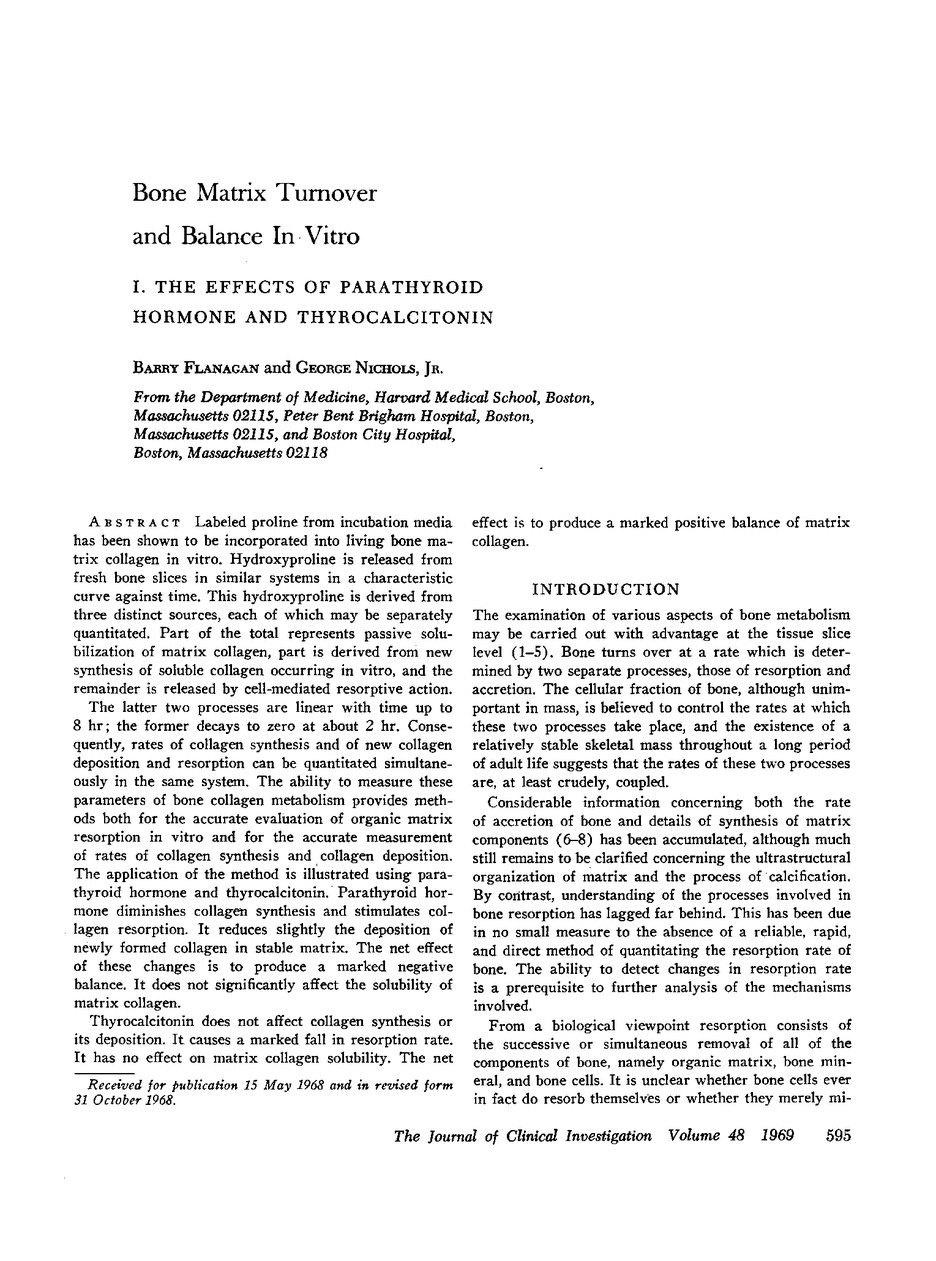 Labeled proline from incubation media has been shown to be incorporated into living bone matrix collagen in vitro. Hydroxyproline is released from fresh bone slices in similar systems in a characteristic curve against time. This hydroxyproline is derived from three distinct sources, each of which may be separately quantitated. Part of the total represents passive solubilization of matrix collagen, part is derived from new synthesis of soluble collagen occurring in vitro, and the remainder is released by cell-mediated resorptive action.